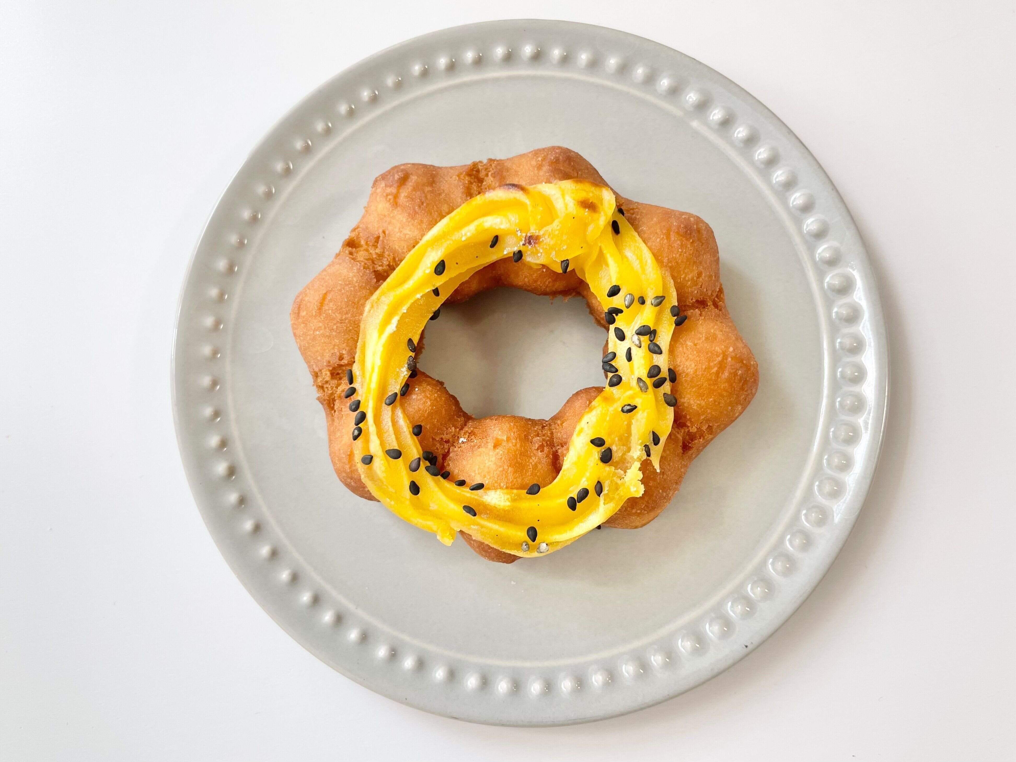 スイートポテトクリームをのせ黒ごまをトッピングし、オーブンで香ばしく焼き上げたドーナツ。