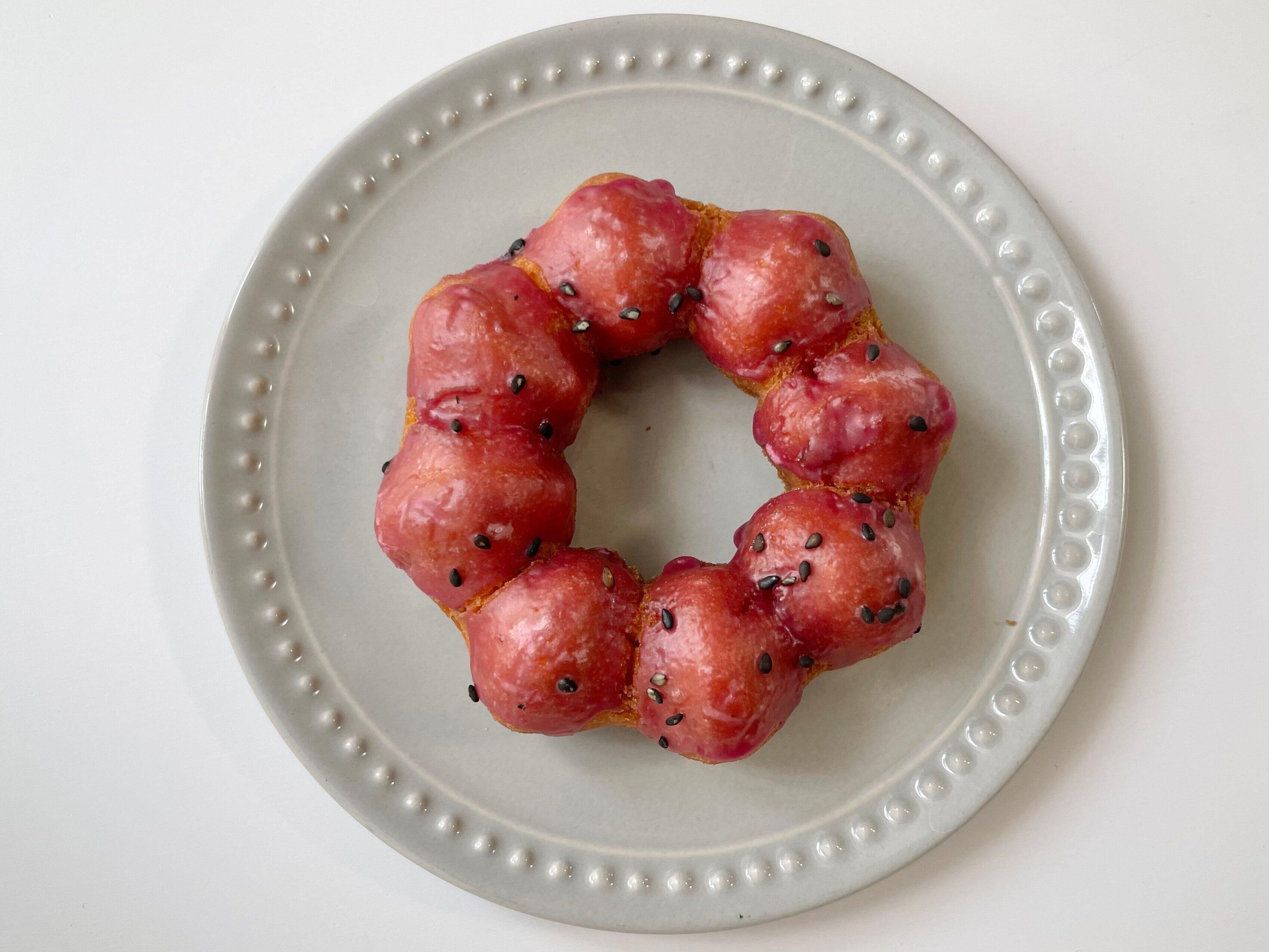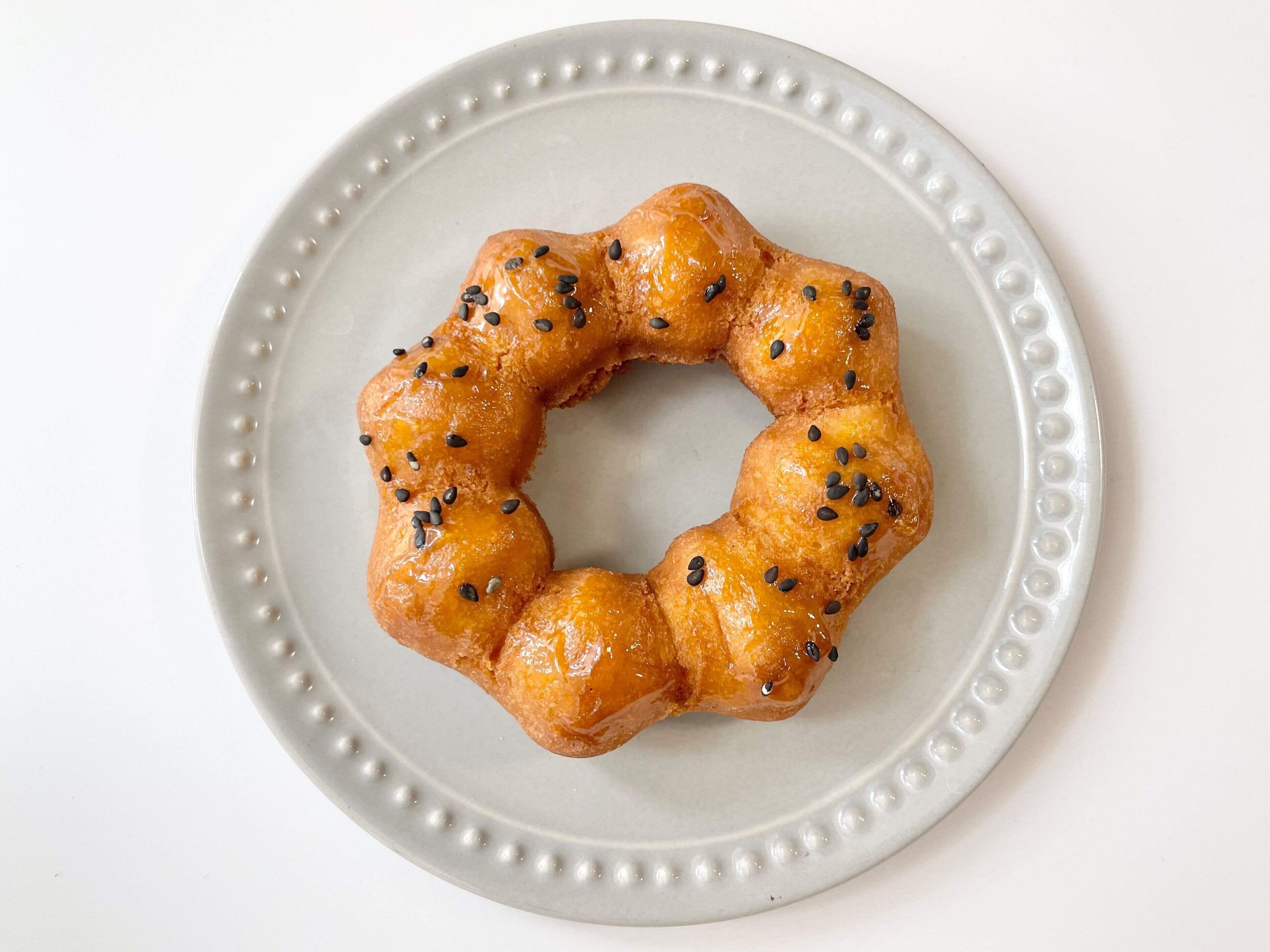 大学いもをイメージしたソースをコーティングして黒ごまがトッピングされたドーナツ。