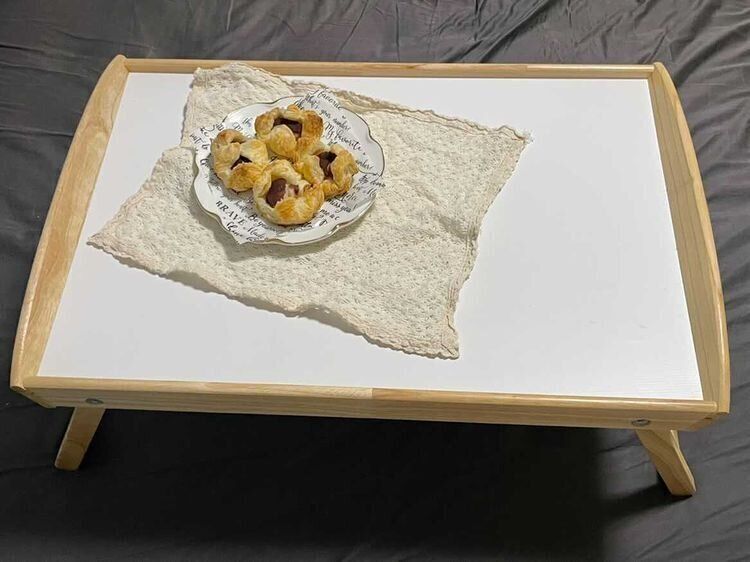 コンパクトに畳めるトレイで持ち運びに便利。おうちカフェに最適で写真映えするアイテムです。子どもにフィットし、部屋でのおやつタイムや勉強にも使っています。テーブルの縁が立ち上がったデザインなので、こぼれても安心。