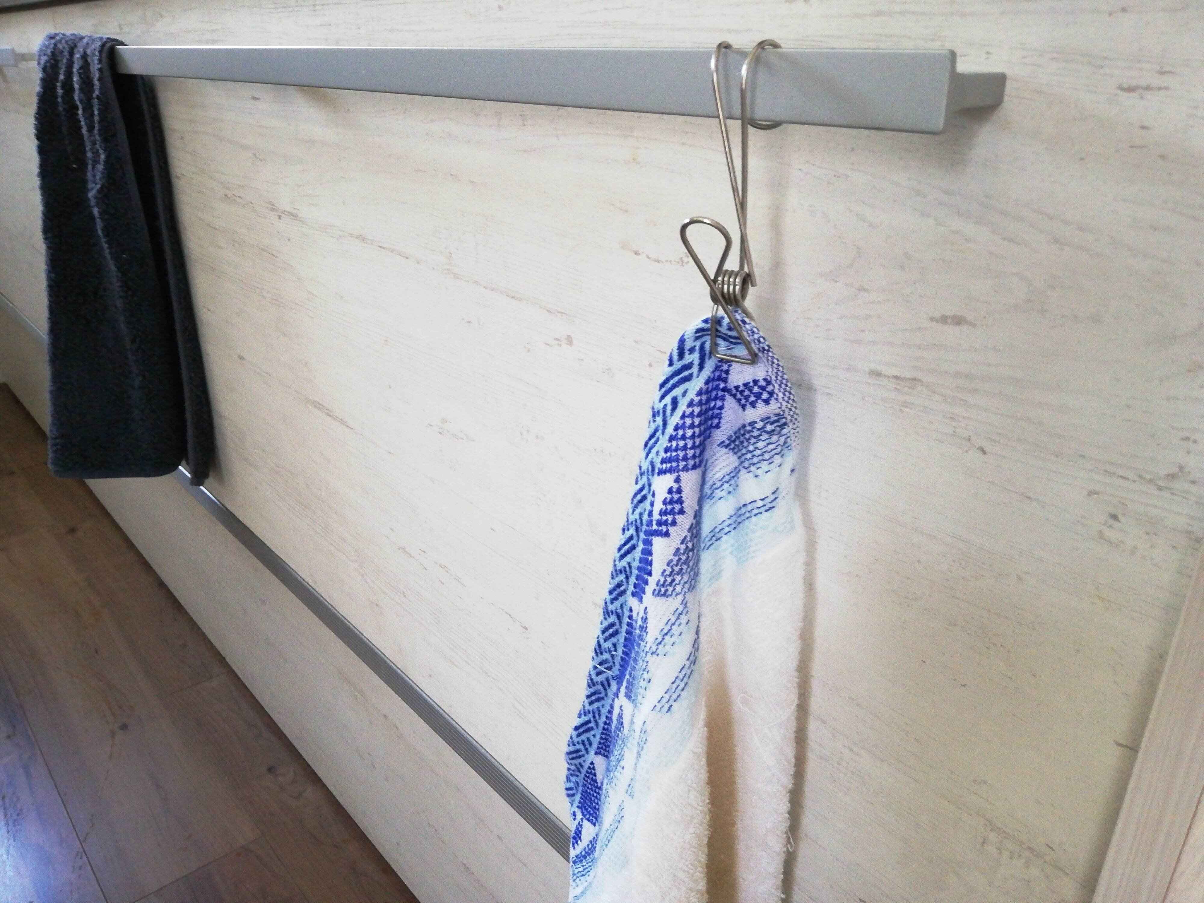 100均で購入したハンギングステンレスピンチ。台所のふきんを引っかけておくのに重宝しまくり!流し台の下に引っかけて、洗い物をふくふきんをかけておくのにちょうどいいんです。