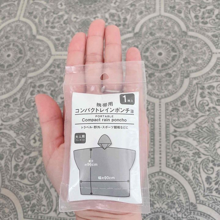DAISOの「携帯用コンパクトレインポンチョ」(110円)が優秀!手のひらサイズなのに、広げると大人用のポンチョ式のカッパになります。