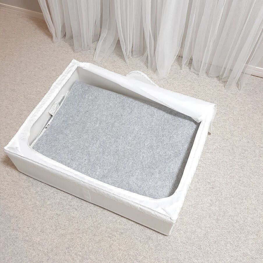 イケアの「スクッブ 収納ケース」は軽くて丈夫で立てても使えるので、クローゼットや狭いスペースでも布団類をすっきり収納できます。これがないと、今の日本の住宅事情片づかないのではないかと思うほど(笑)。