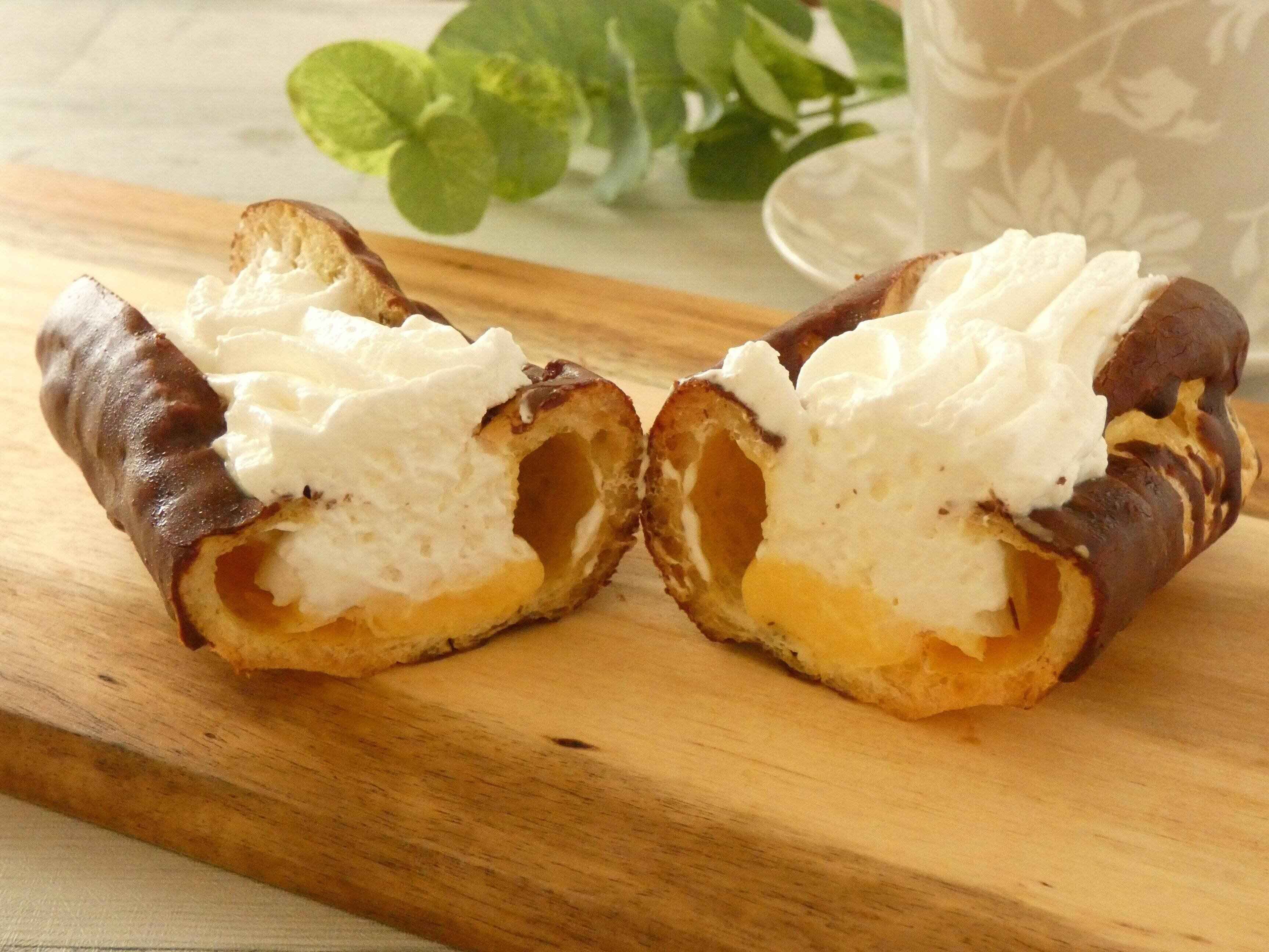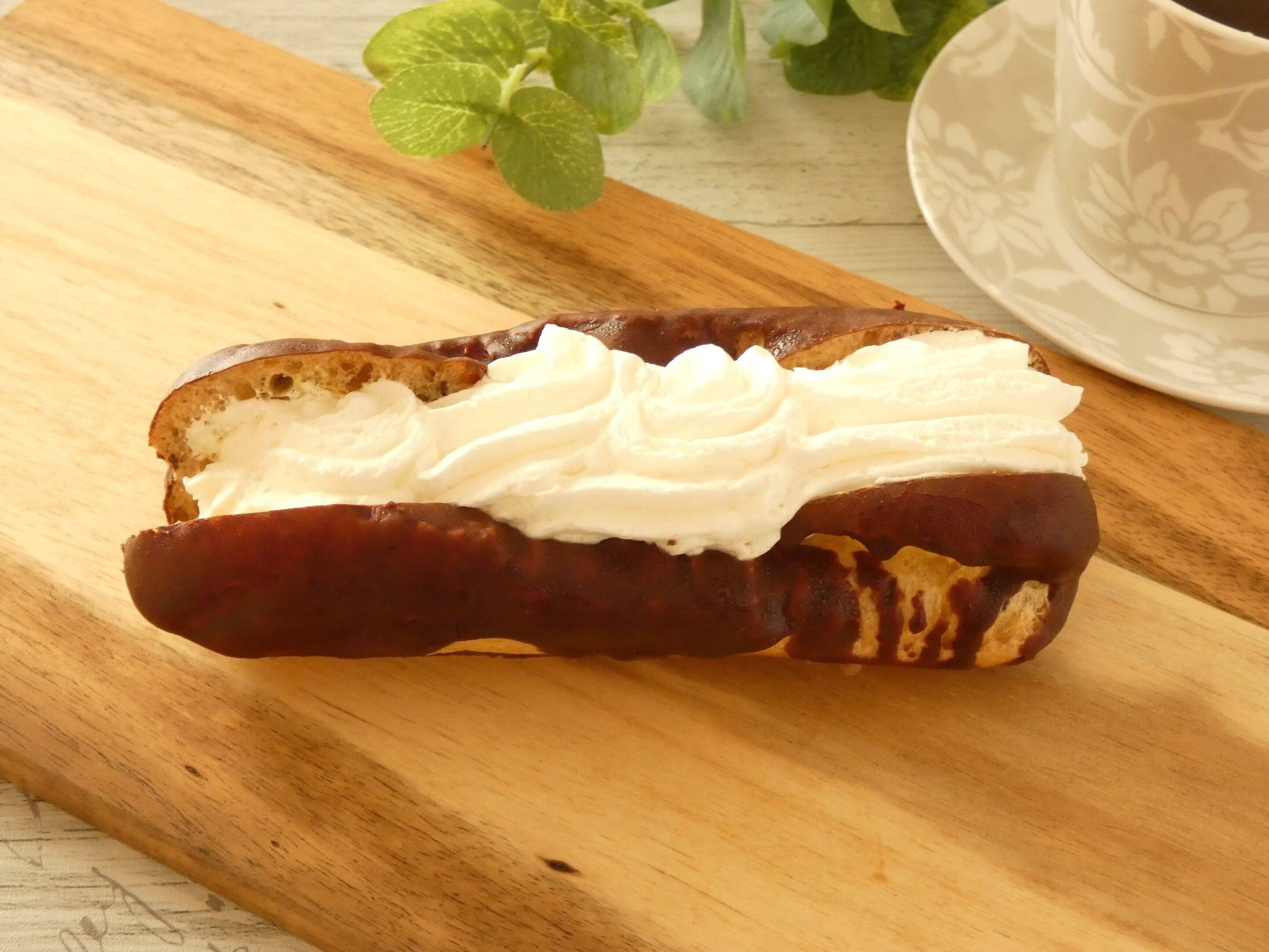 エクレアにはたっぷりのホイップクリームが絞ってあり、ホイップクリームの下にはカスタードクリームが入っています。