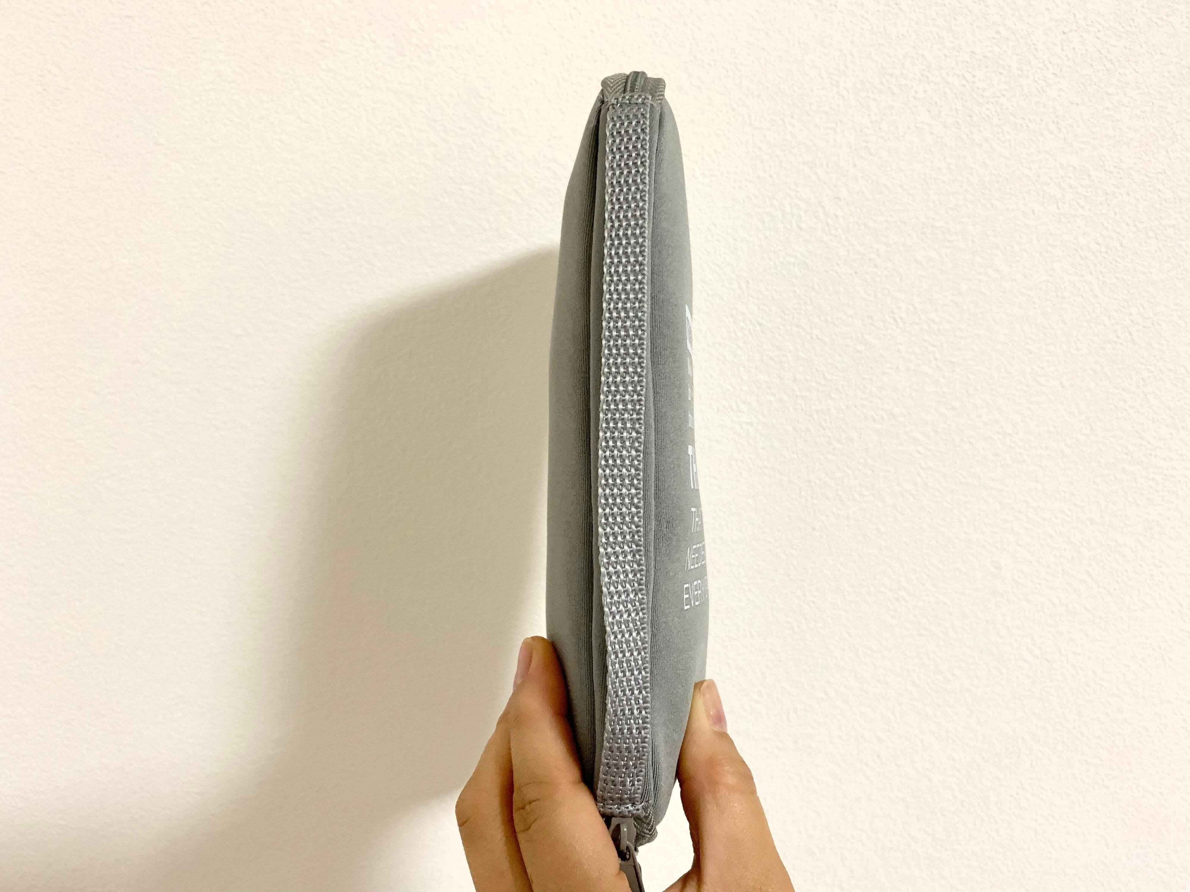 全てを収めてファスナーをしめました。閉じてもコンパクトです。横から見たらこんな感じになります。