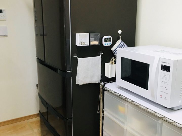 さっと手に取れる冷蔵庫横に使用頻度の高いものを集約しました。台ふきん、キッチンタイマー、ミトンは必ず毎日使うものです。出しっぱなしにするのは好きではないのですが、使いやすさには敵いません。