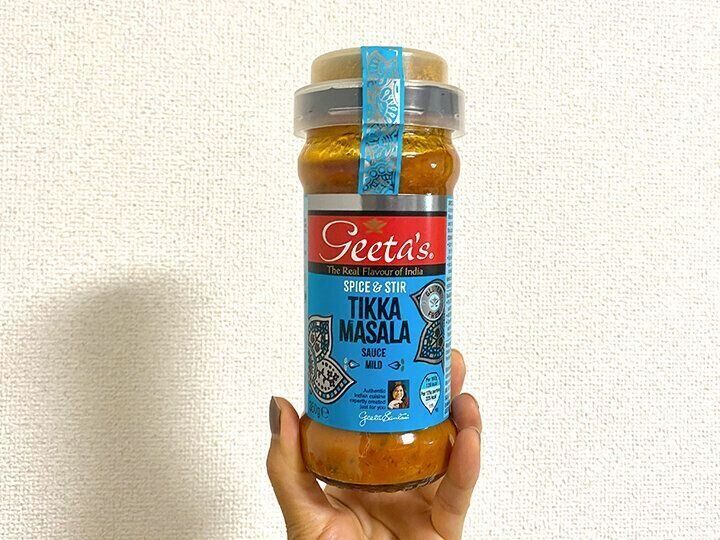 ギータ ティッカマサラというイギリスでは人気NO1のカレーらしいです。上にスパイス、下にソースが入っており、これ一本で本場のカレーになるとのこと!350g入りで462円でした。