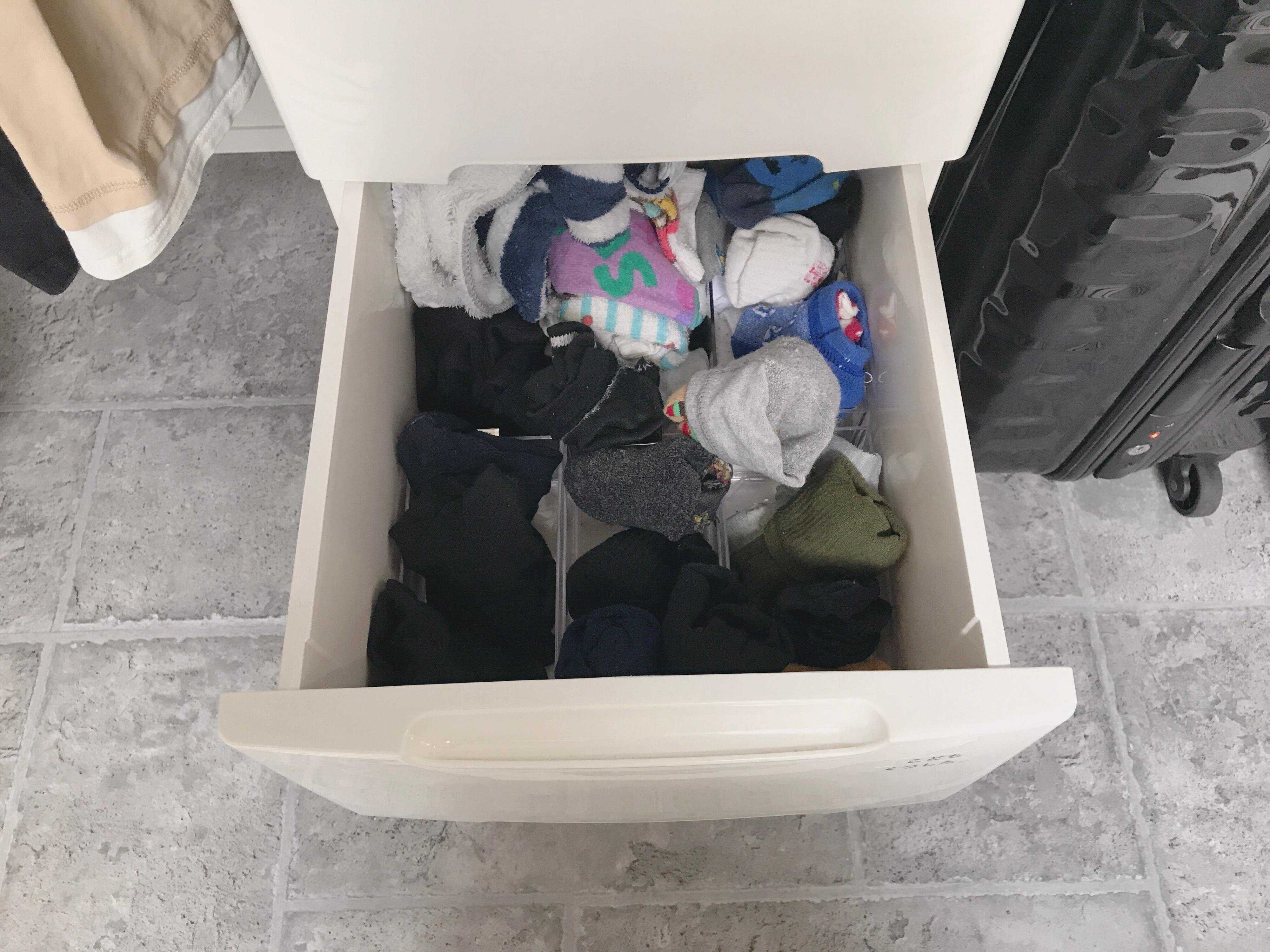我が家の子ども達3人の靴下がしまってある引き出しです。一応中にクリアケースがあって仕切っているのですが、高さが低いためにすぐ混ざり合ってごちゃごちゃになってしまいます。