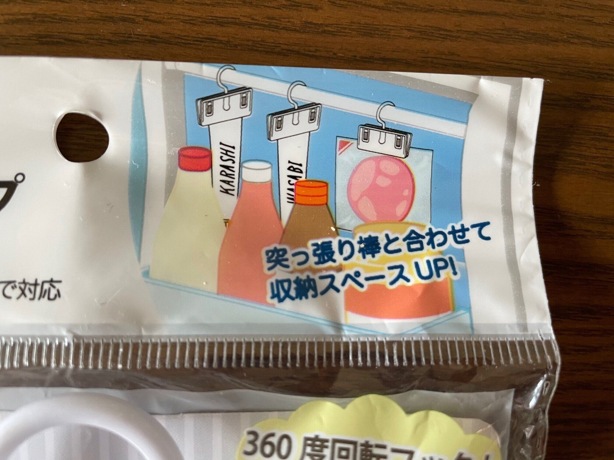 パッケージには、突っ張り棒とあわせて使う方法が書かれていました。なるほどこうすれば収納もUPできそうです。冷蔵庫内に限らず、いろいろな場所で使えそうですね。