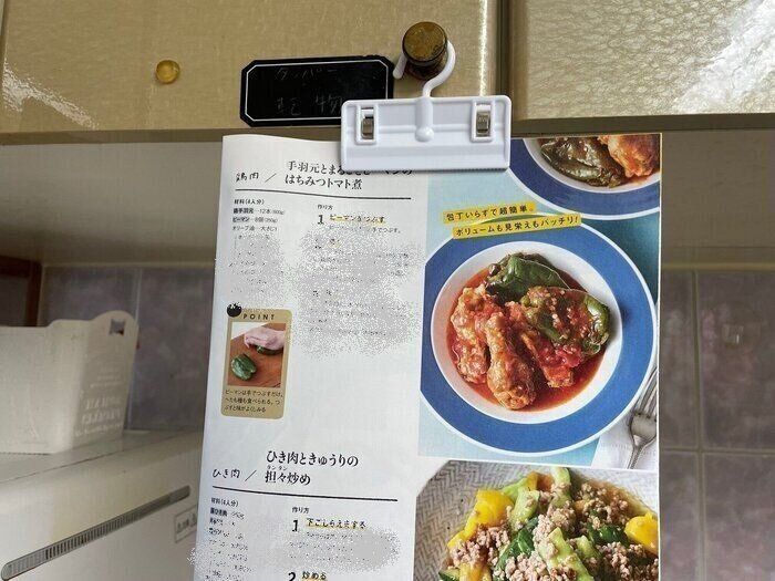 幅広のしっかりしたクリップなので、レシピをはさむこともできました。キッチンの吊り戸棚の取っ手にひっかければ、見やすい高さで料理をしながらレシピを確認するのに便利ですよ。