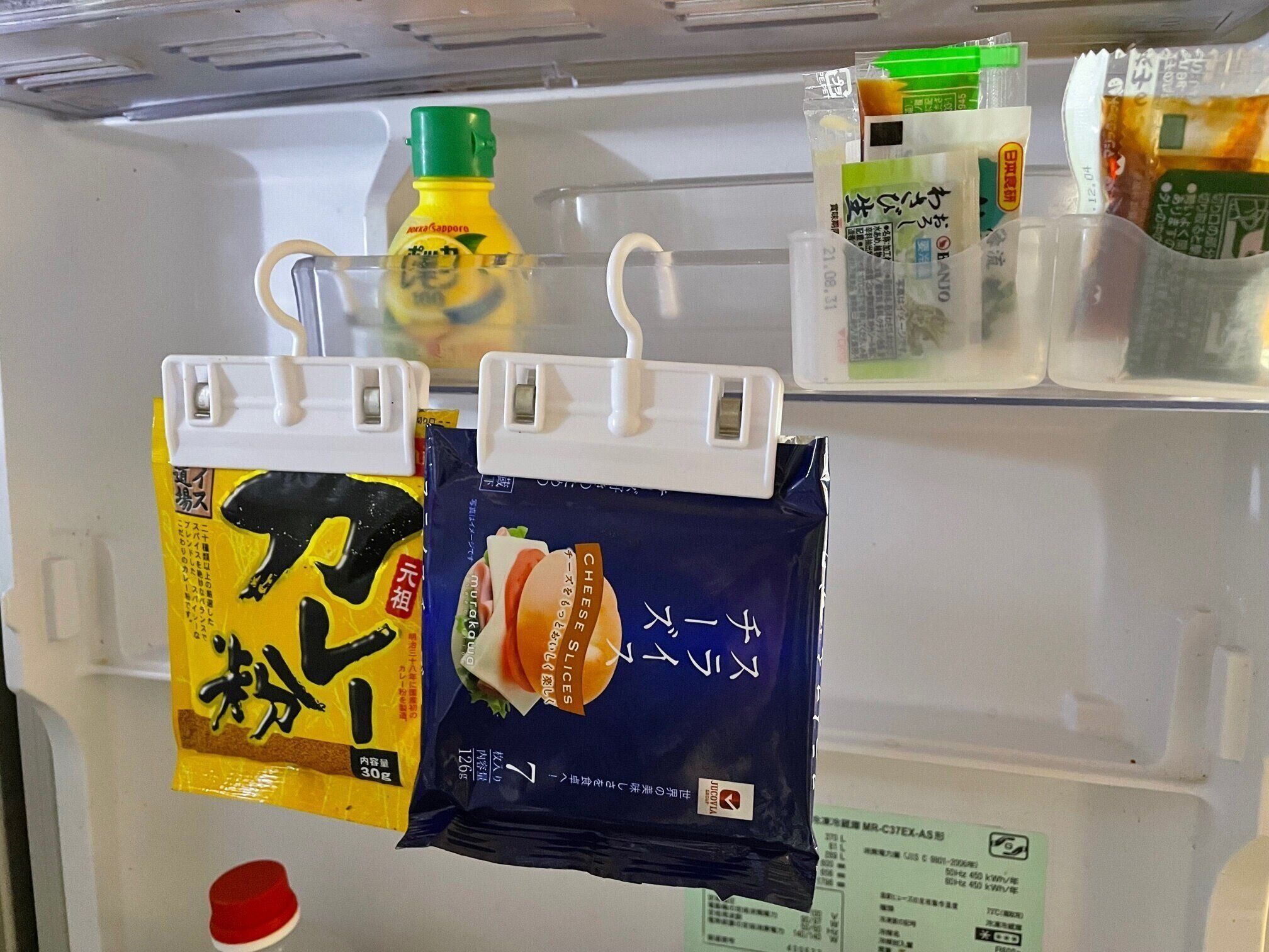 冷蔵庫のポケットに、開封したカレー粉とスライスチーズをクリップではさんでぶら下げました。収納ケースに入れる必要もなく、扉を開ければすぐ目に入るので使い忘れも防げそうです。扉を開け閉めしても落ちることもありませんでした。これはなかなかいいですね!