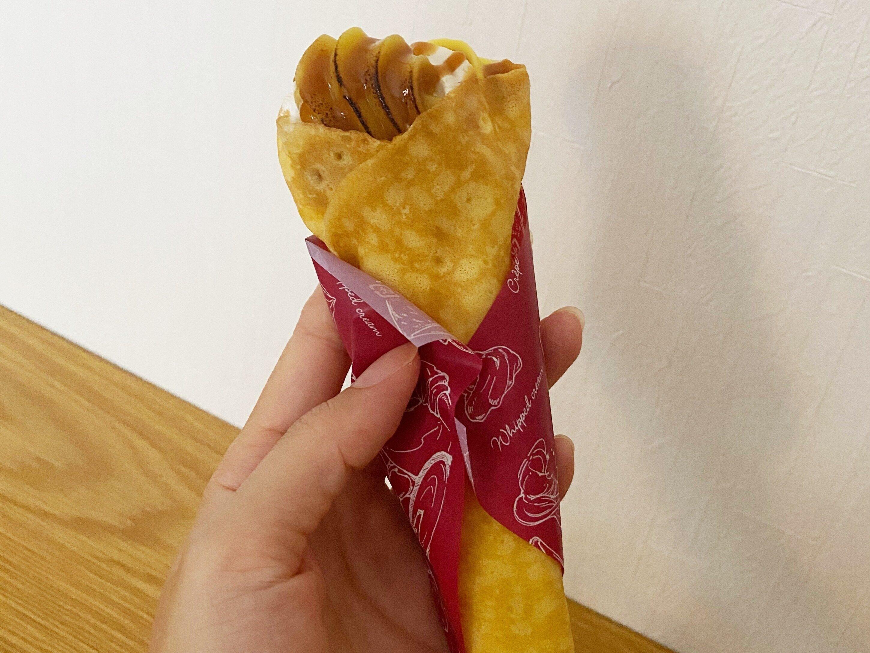 食べ進めていくとスポンジ生地が登場!後半はケーキのような味わいを楽しめます。手が汚れないよう工夫がされていて、ワンハンドで食べられるところもうれしいポイントです。