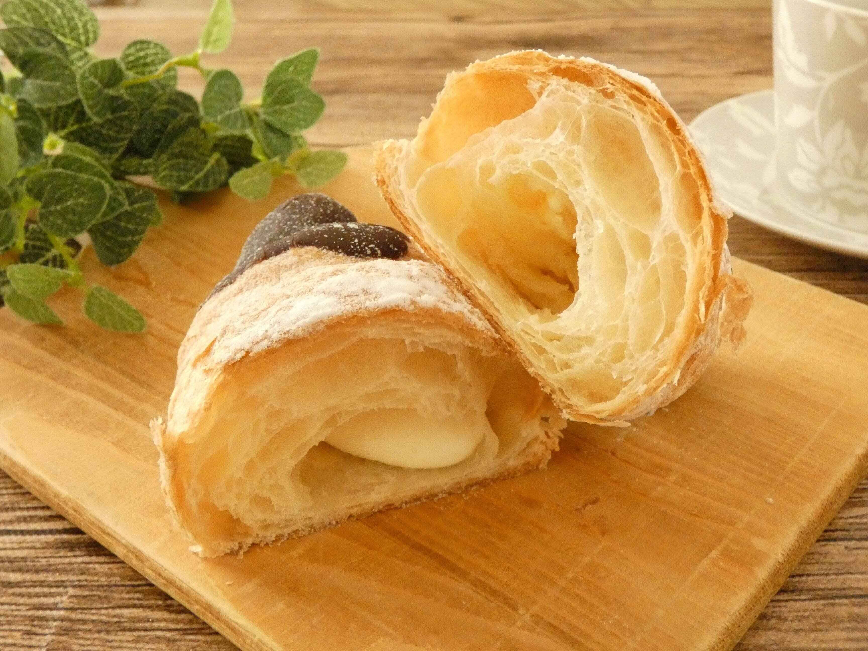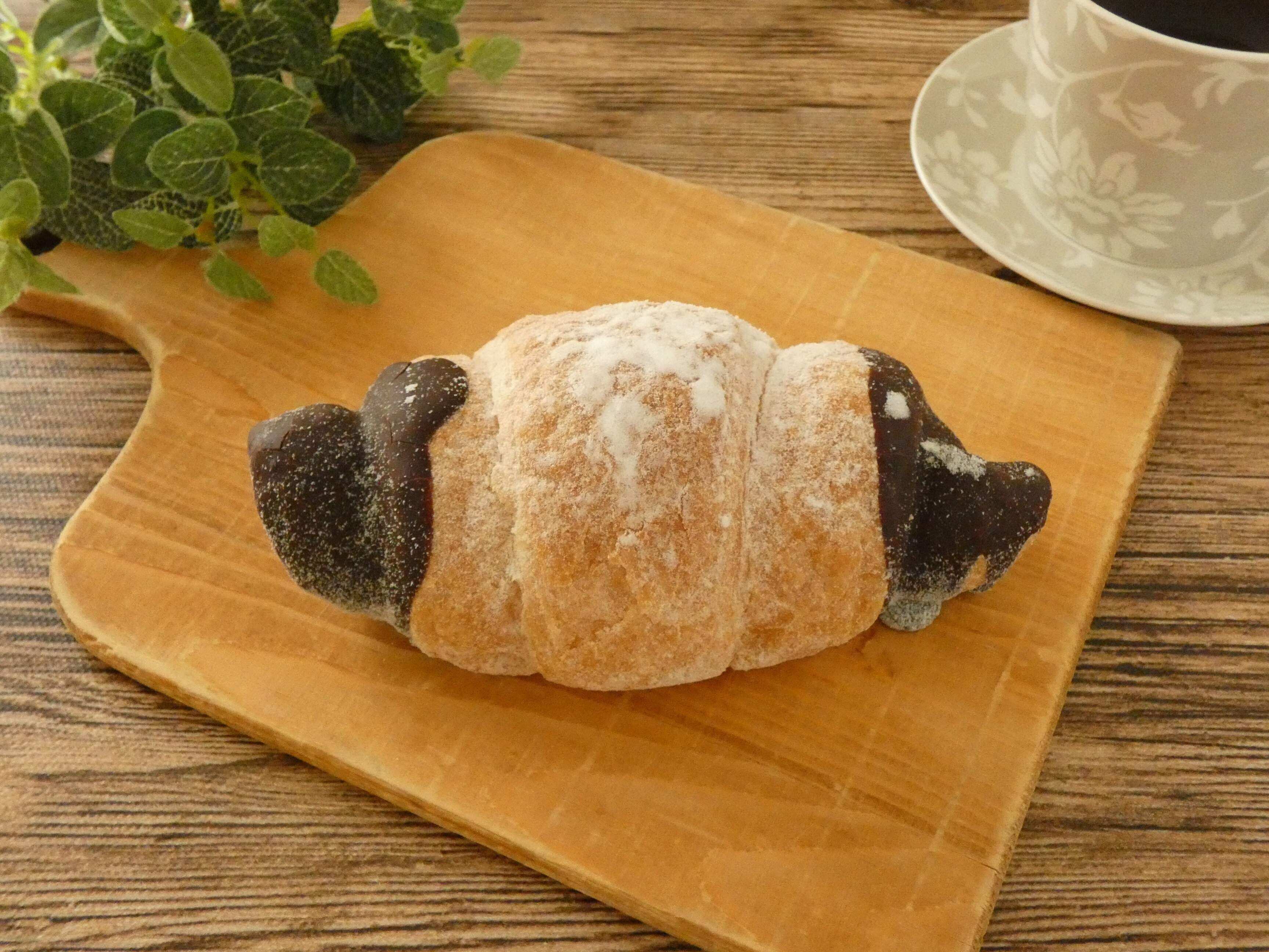 クロワッサンの生地にホイップクリームが入っていて、生地の両端にチョココーティングがしてあります。全体に粉砂糖がふってあり、形がコロンとしてかわいいです。