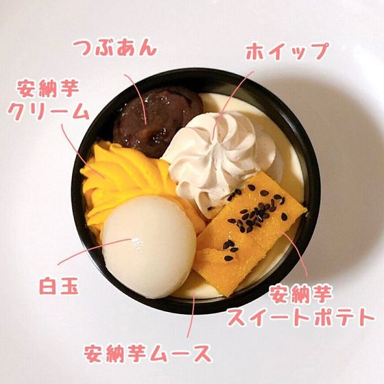 見た目から賑やかな和パフェ。白玉、スイートポテト、2種のクリーム、あんこ…と盛りだくさんのスイーツです。ねっとりお芋代表格の安納芋を使用しています。(税込み298円、302kcal)