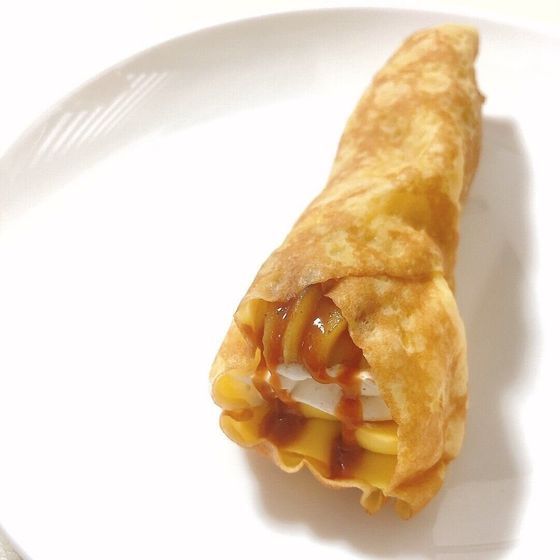 ファミリーマート特有のワンハンドで食べられる専門店風クレープです。大麦を配合したもちもち生地に、さつまいもクリームと練乳入りホイップのダブルクリーム。そこにバーナーであぶった甘さ際立つスイートポテトが入っています。キャラメルのようなソースが食欲をそそります。(税込298円、298kcal)