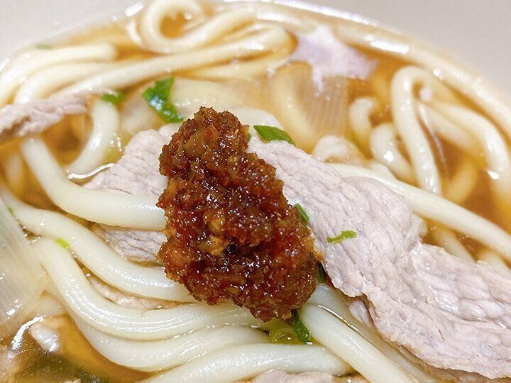 いつものお出汁がきいている普通のうどんにサテトムを入れると、まったく別のエスニックなうどんができあがります!汁まで飲み干してしまうくらいおいしくなります。味変に最適!