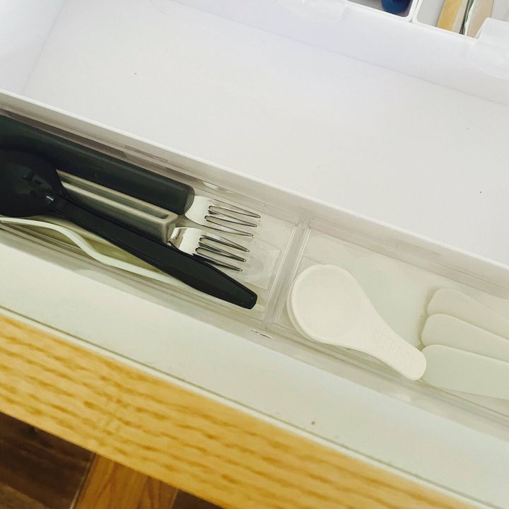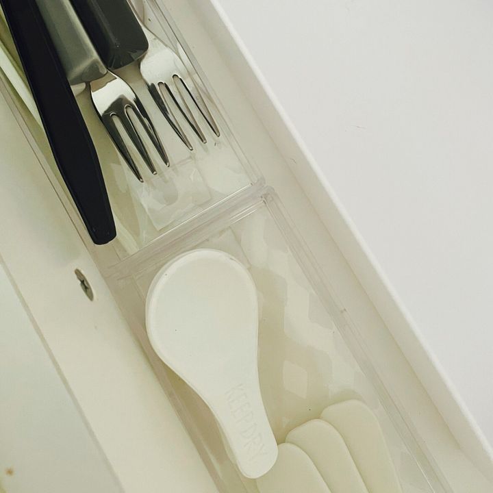 わが家のカトラリーが入った引き出しは、いろんな大きさのケースで仕切って収納していますが、引き出しを開けるたびにケースが動いてガチャガチャ音がしていました。