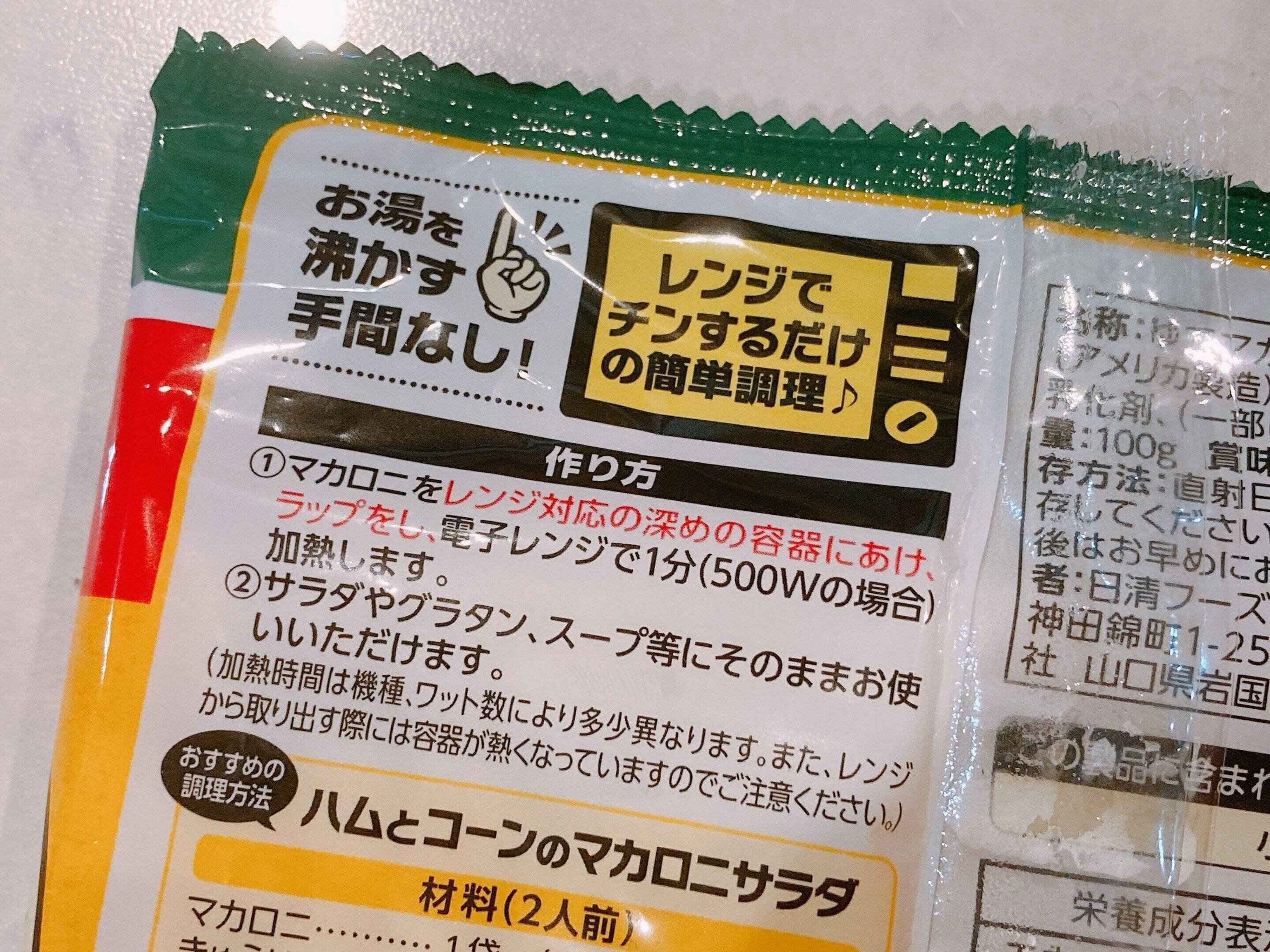 作り方はとても簡単。袋の裏面に書かれているように、マカロニをレンジ対応容器に入れてラップして電子レンジで加熱するだけ。500Wで1分というほんの短時間ですぐ使える状態のマカロニが出来上がるのです。
