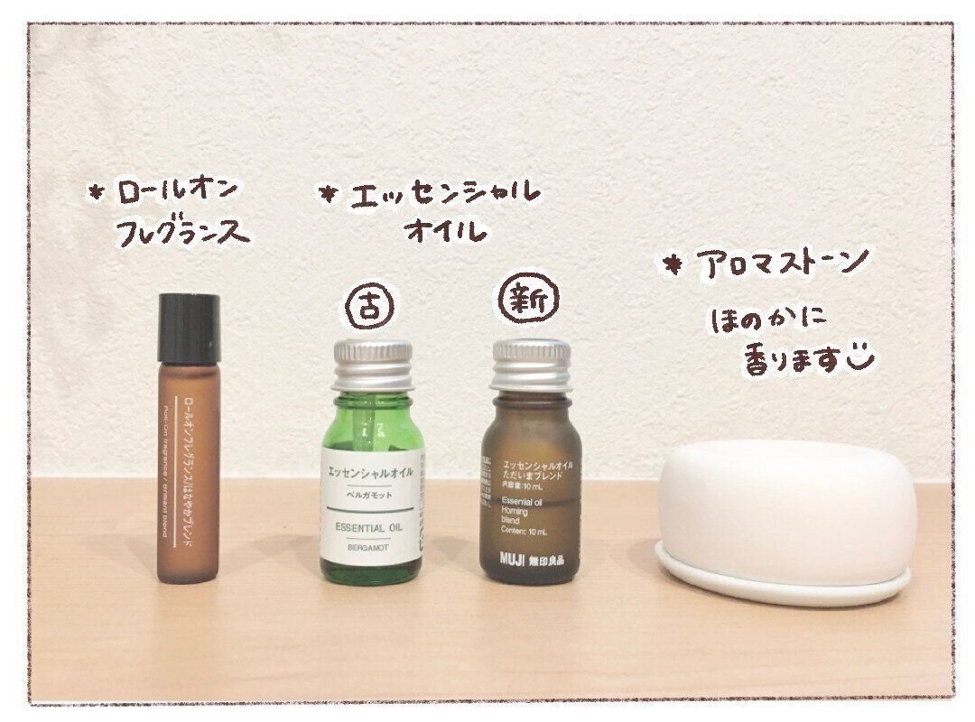 無印良品には他にも様々なフレグランスがあります。自分はディフューザーなどのお手入れが苦手なので、「アロマストーン」に「エッセンシャルオイル」を数滴垂らして香りを楽しむことが多いです。また、さっとつけられる「ロールオンフレグランス」もおすすめです。