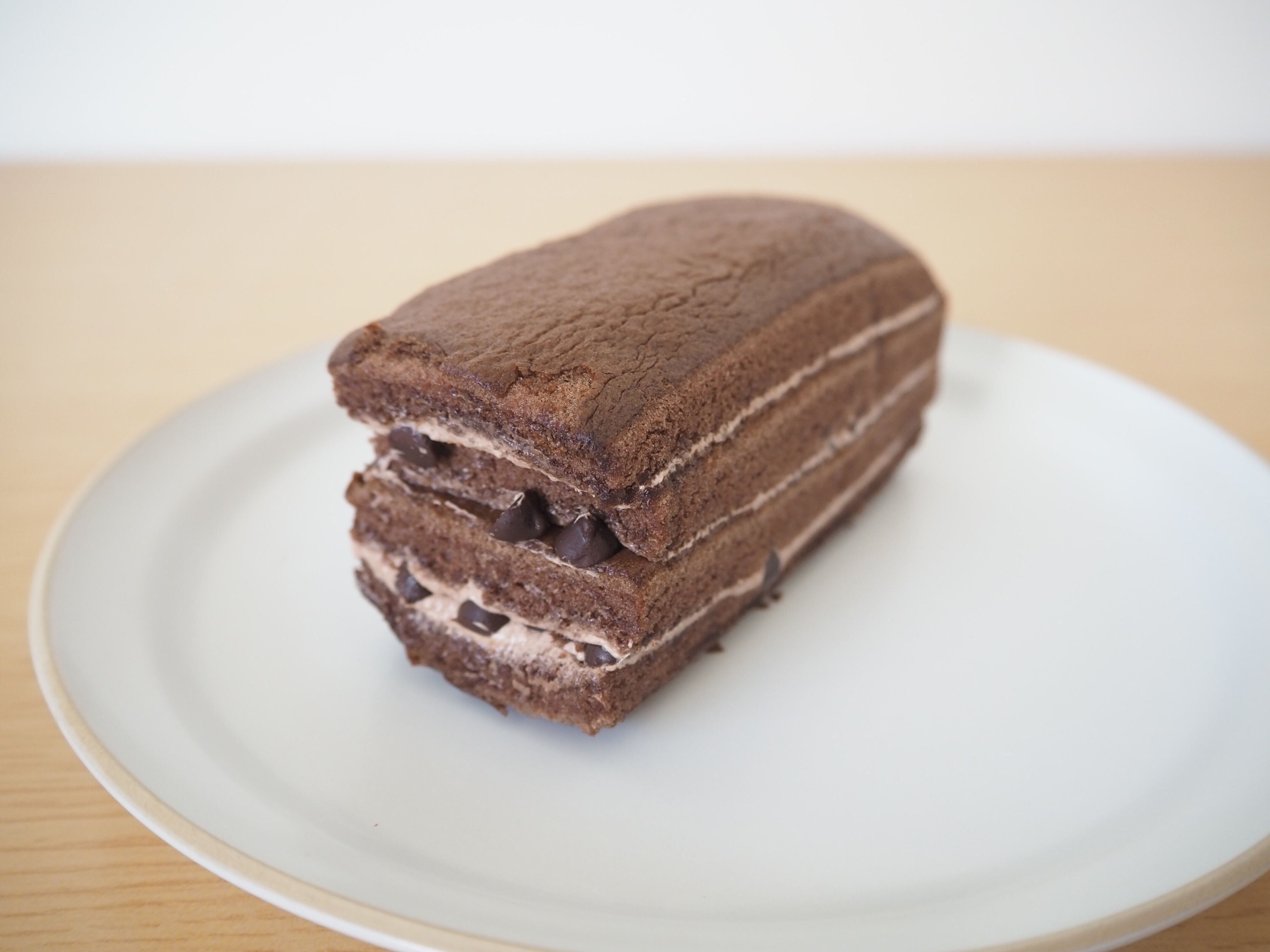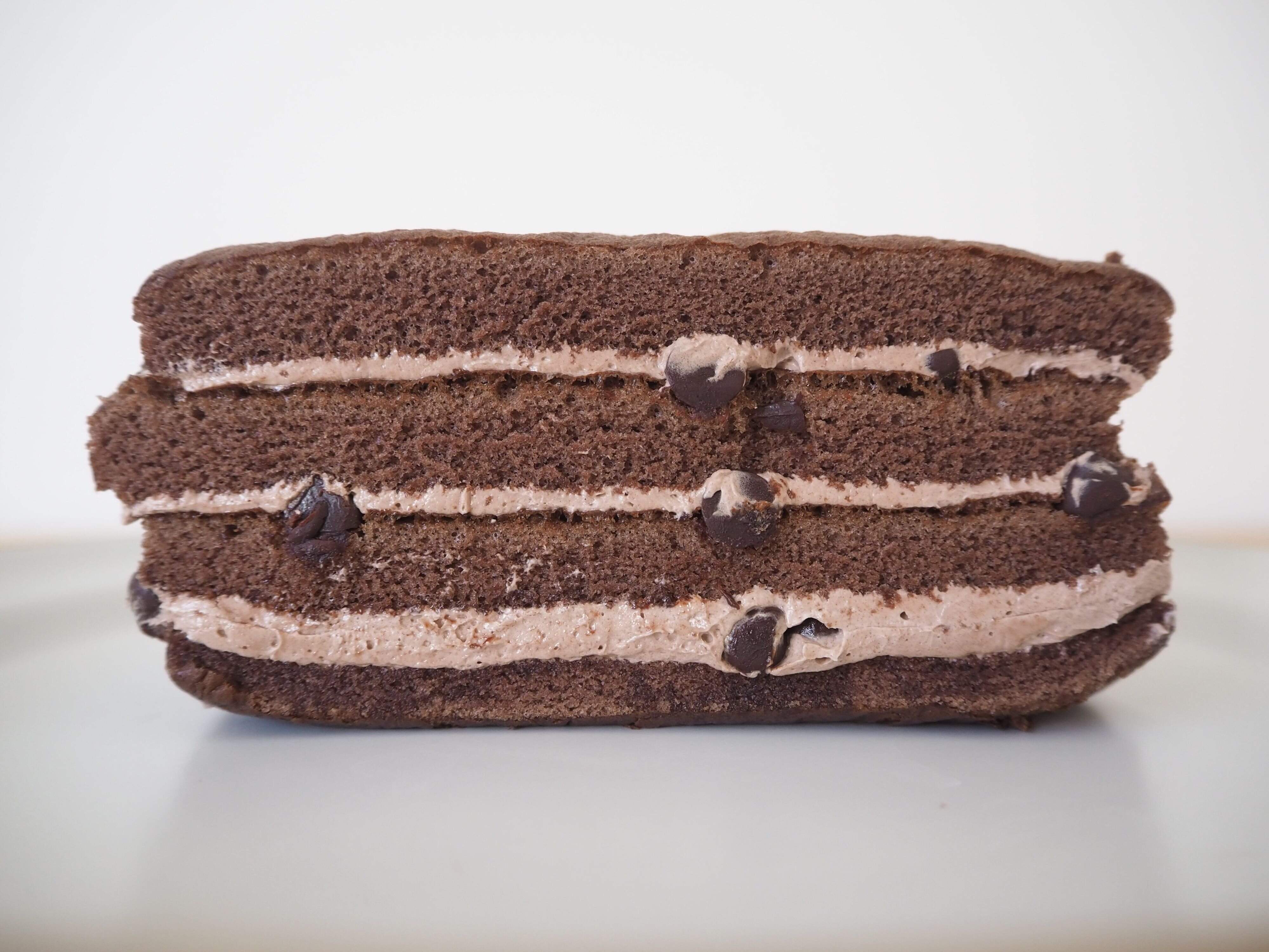4枚のチョコレートスポンジに、クリームとチョコチップがサンドされています。