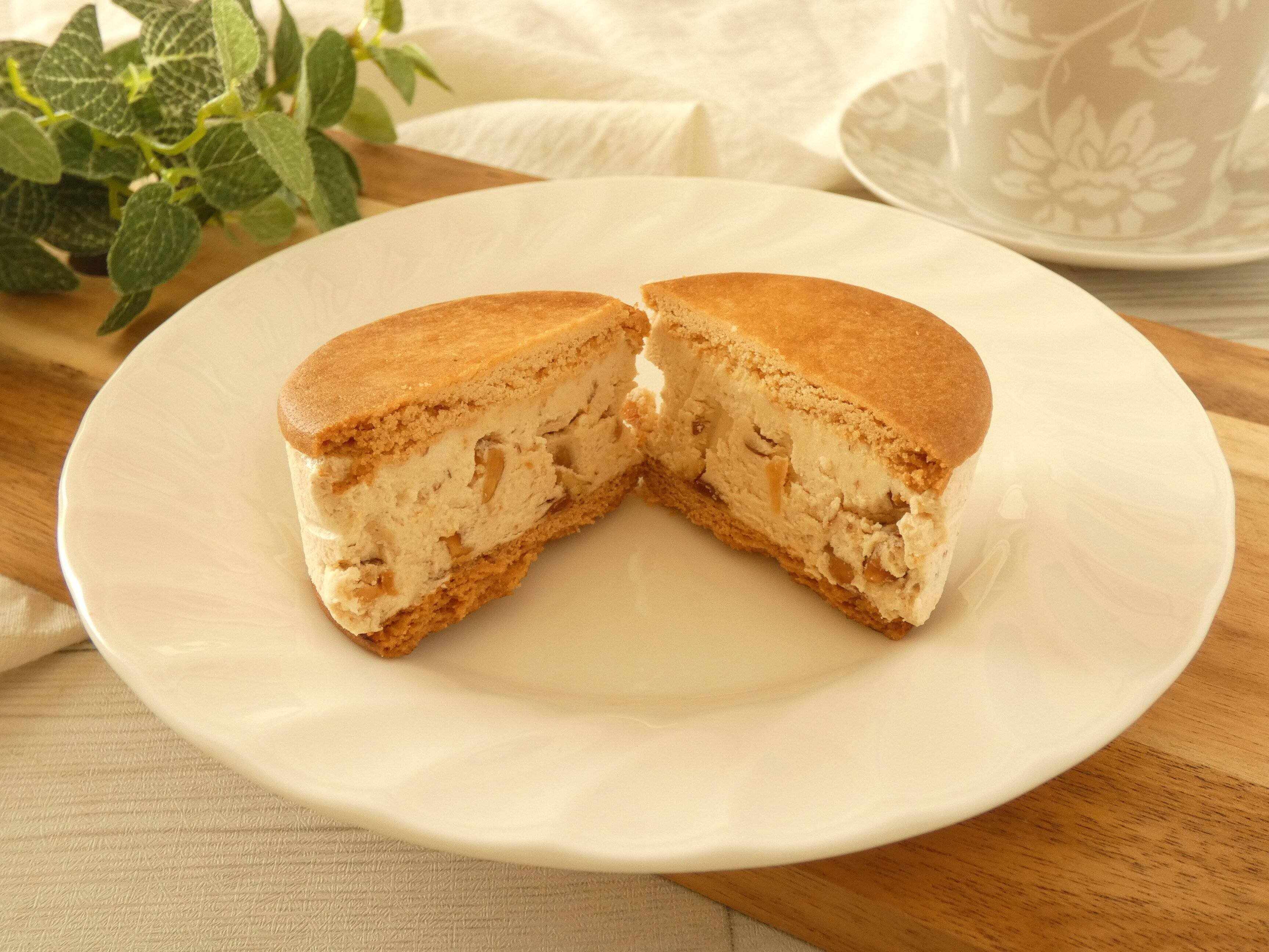 カットするとホロホロとくずれるビスケットにふんわりクリームがぎっしり。さらにアーモンドもたっぷり入っています。食べてみるとビスケットのバターの香りが良くて、口の中でくずれる度にふわっと香りが広がります。クリームはふんわり軽くて、キャラメル味で濃厚なのにペロリと食べられる美味しさ。さらにアーモンドのザクザク感がとても良くて、食べ応えバッチリです!