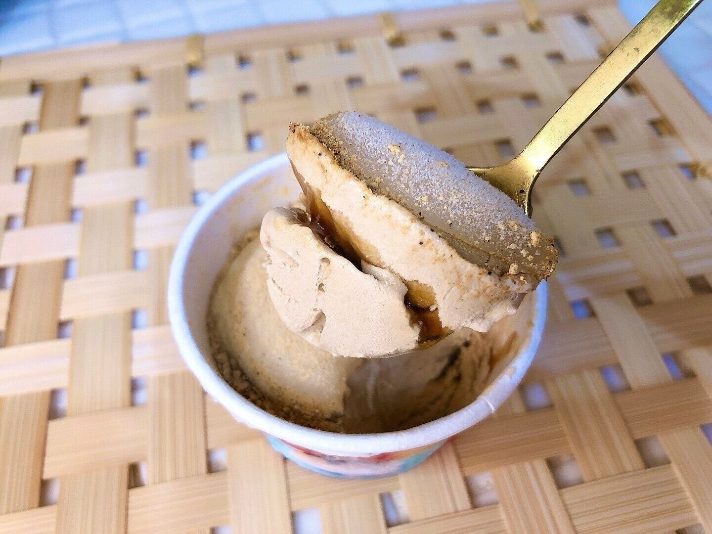 蓋を開けると一面みたらしソースがかかっていておもちも顔を出しています。その下は胡桃がたっぷり入ったミルクアイスクリームになっています。