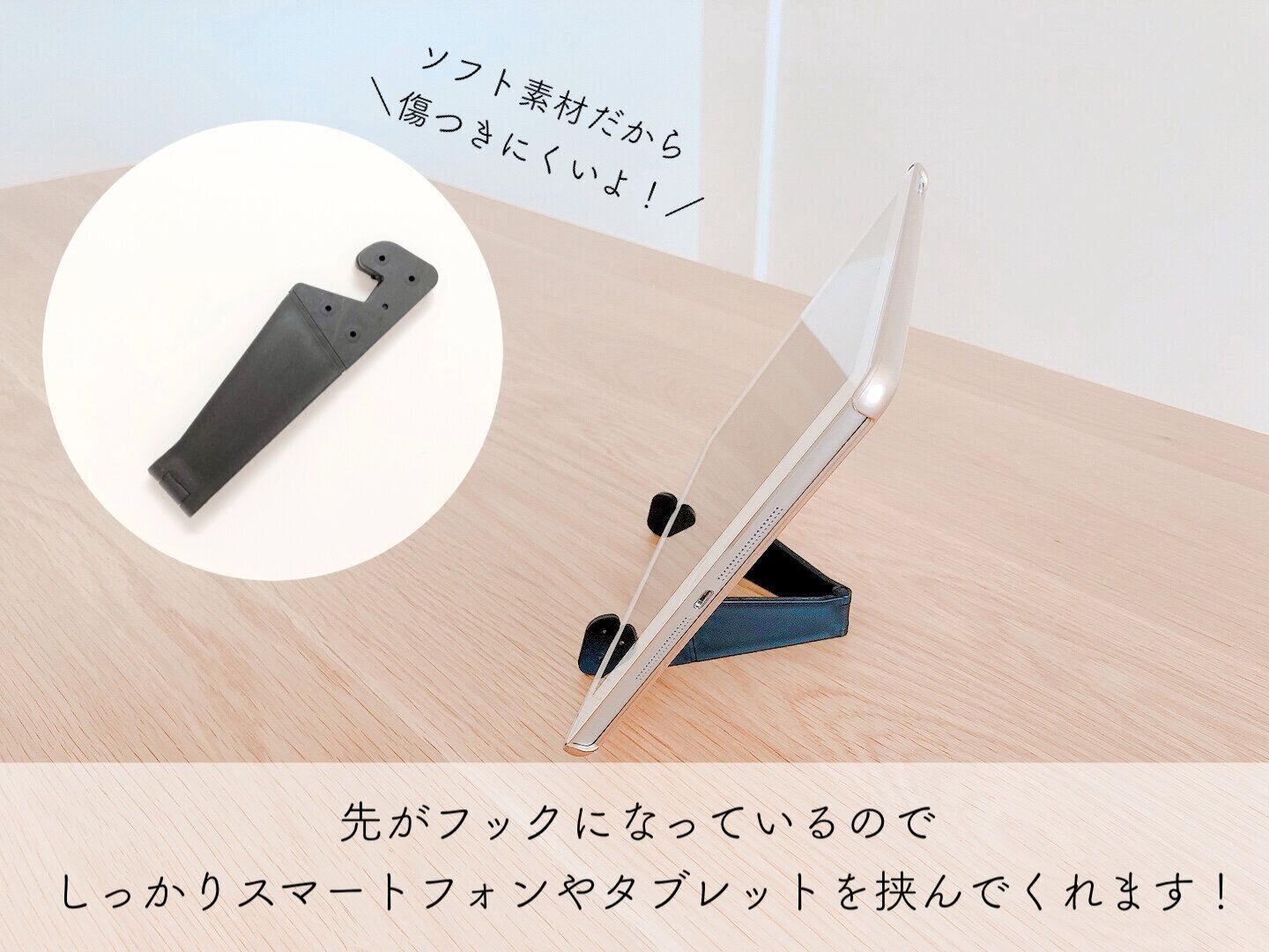 薄いからって侮るなかれ、スマートフォンだけでなく大きなタブレットだって対応しています。厚さ約9mmまでOKです。しかも先がフックになっていてしっかり挟んでくれるので、安定感も抜群!