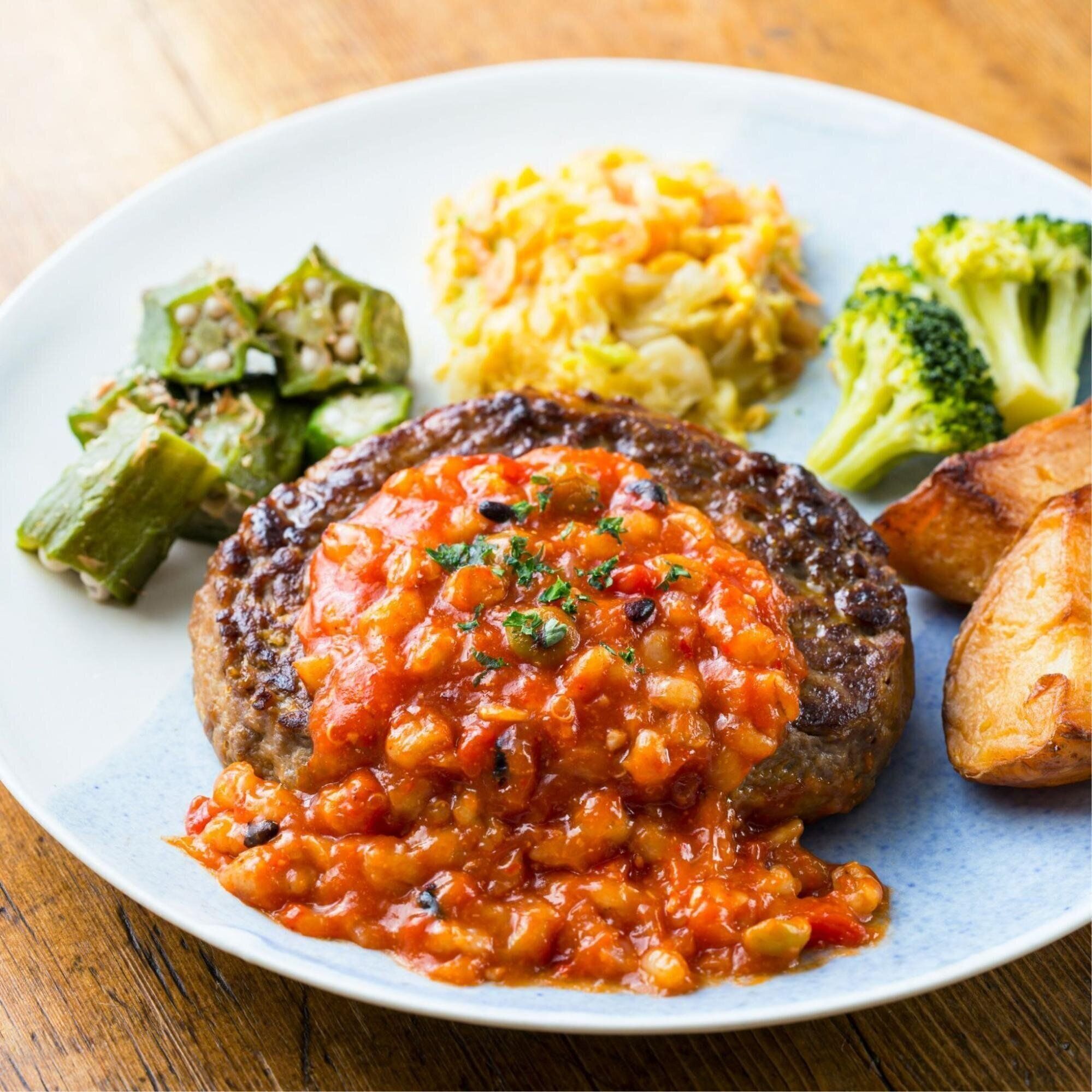 もち麦入りチリソースたっぷりハンバーグ