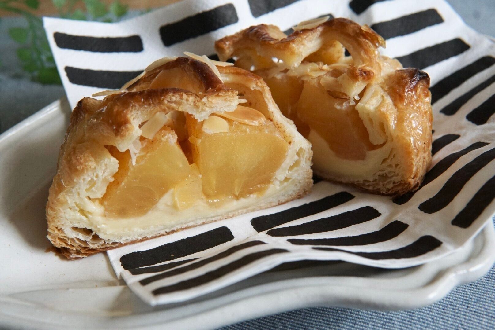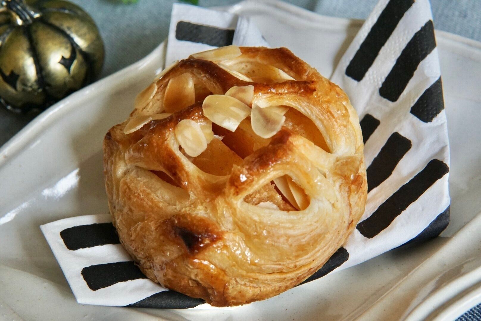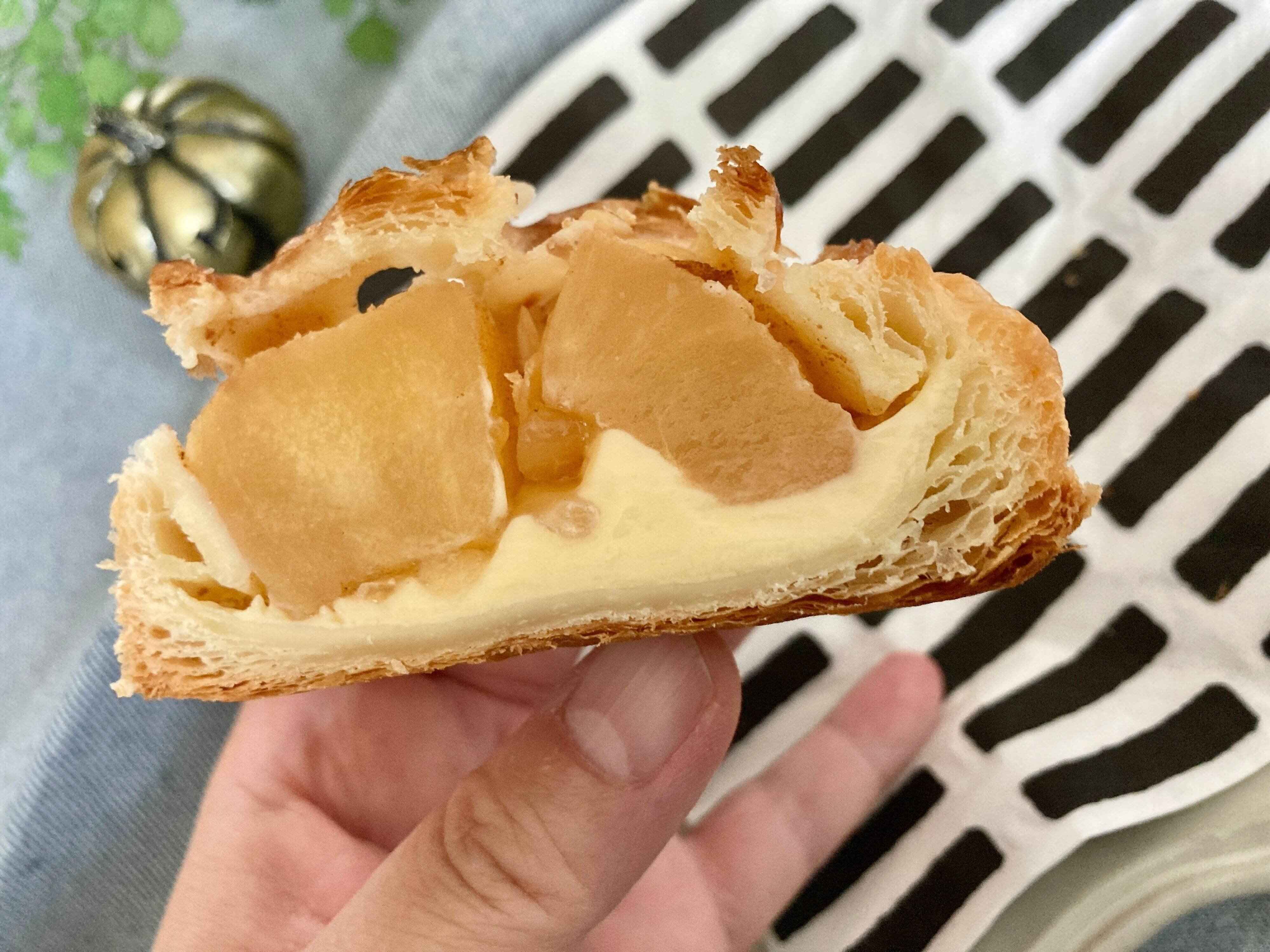 秋バージョンには、カスタードクリームにキャラメルペーストが加えられているそうです。個人的な感想ですが、言われてみればほんのり香ばしいキャラメルを感じられるな、くらいでした。カスタードクリーム自体の量が少な目で、りんごの控えめな甘さと、とろみを補完する役割をしているのかなと感じています。だからこそ、主役のりんご煮のおいしさが引き立つわけです。