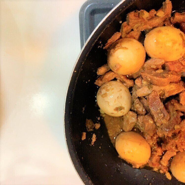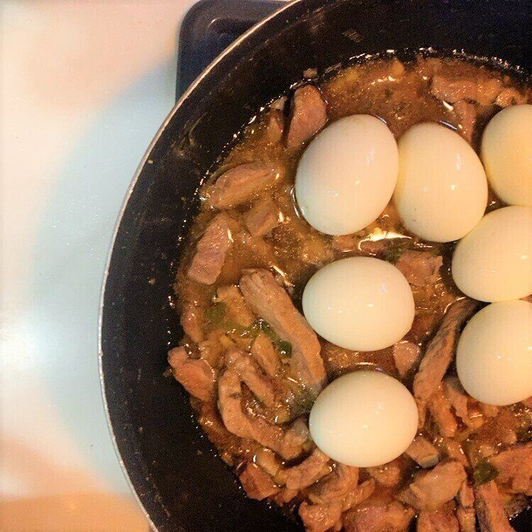本場は皮つきの豚バラ肉を、ゆで卵といっしょに煮込む料理です。
