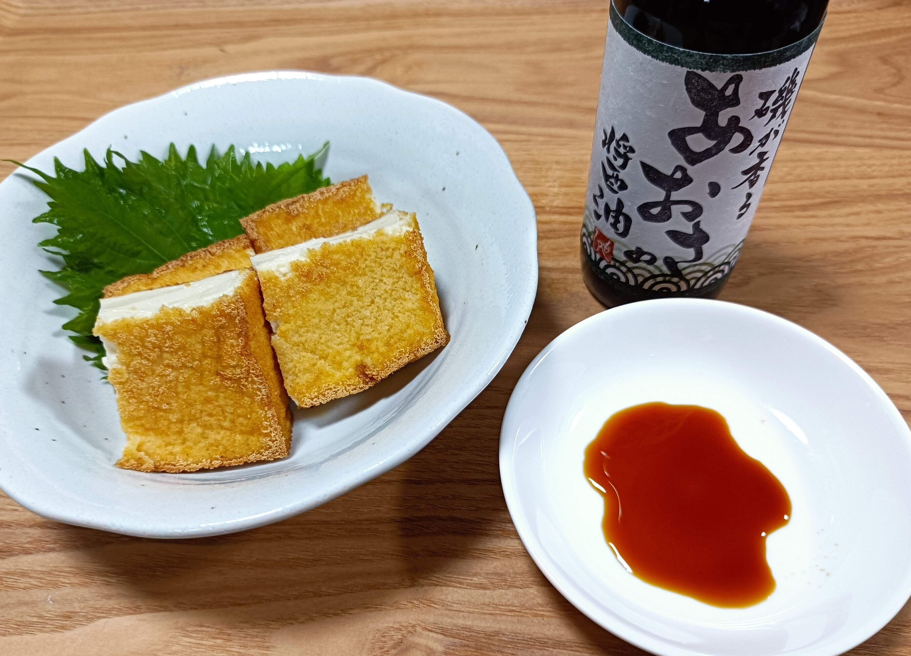 厚揚げをフライパンで軽く焼き、「磯が香る あおさの醤油」をつけて楽しんでみました。