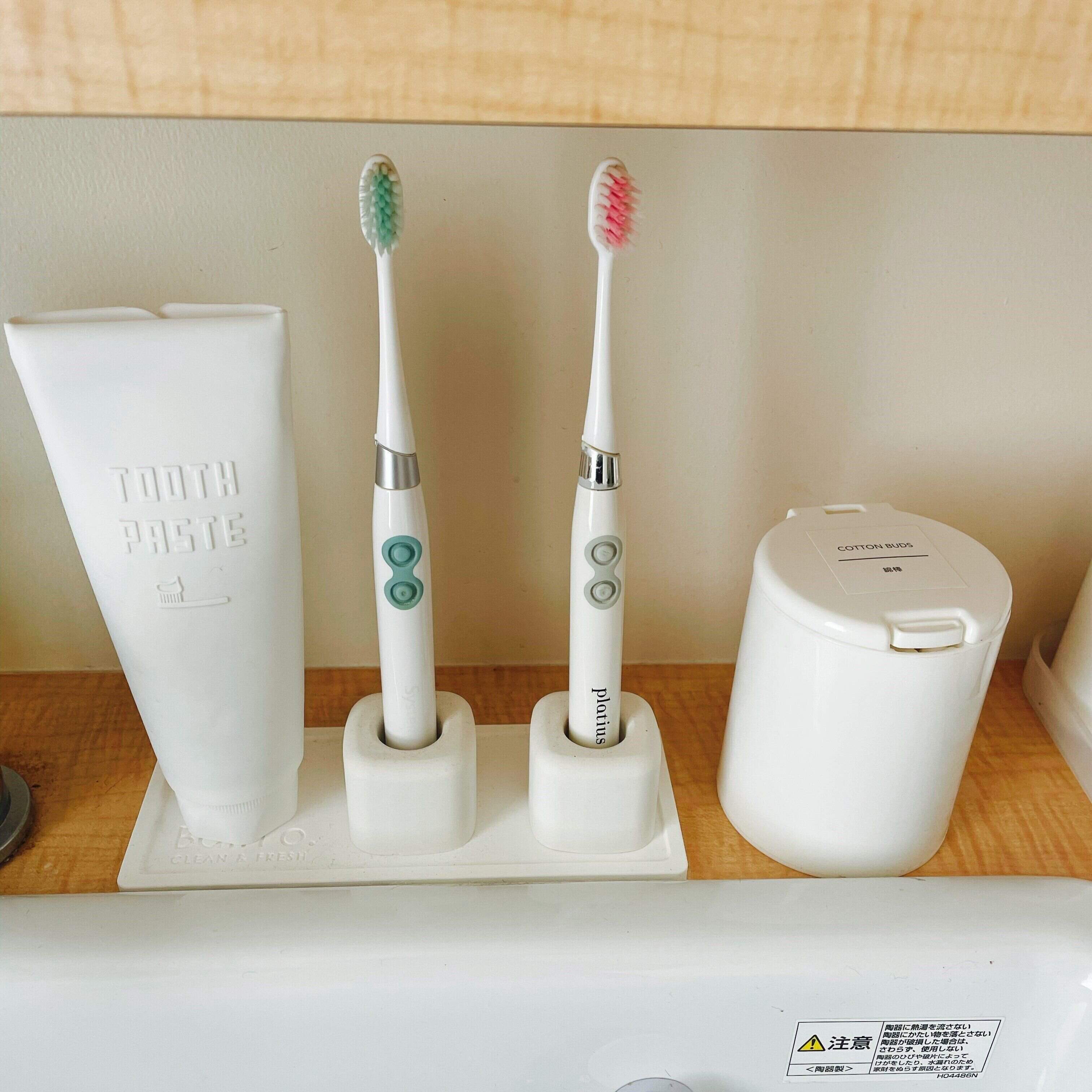 我が家のインテリアはウッド×ホワイトで揃えていますが、相性抜群。ホワイトで統一した綿棒ケースも歯ブラシ横にスタンバイし、いつでも使えるようにしています。
