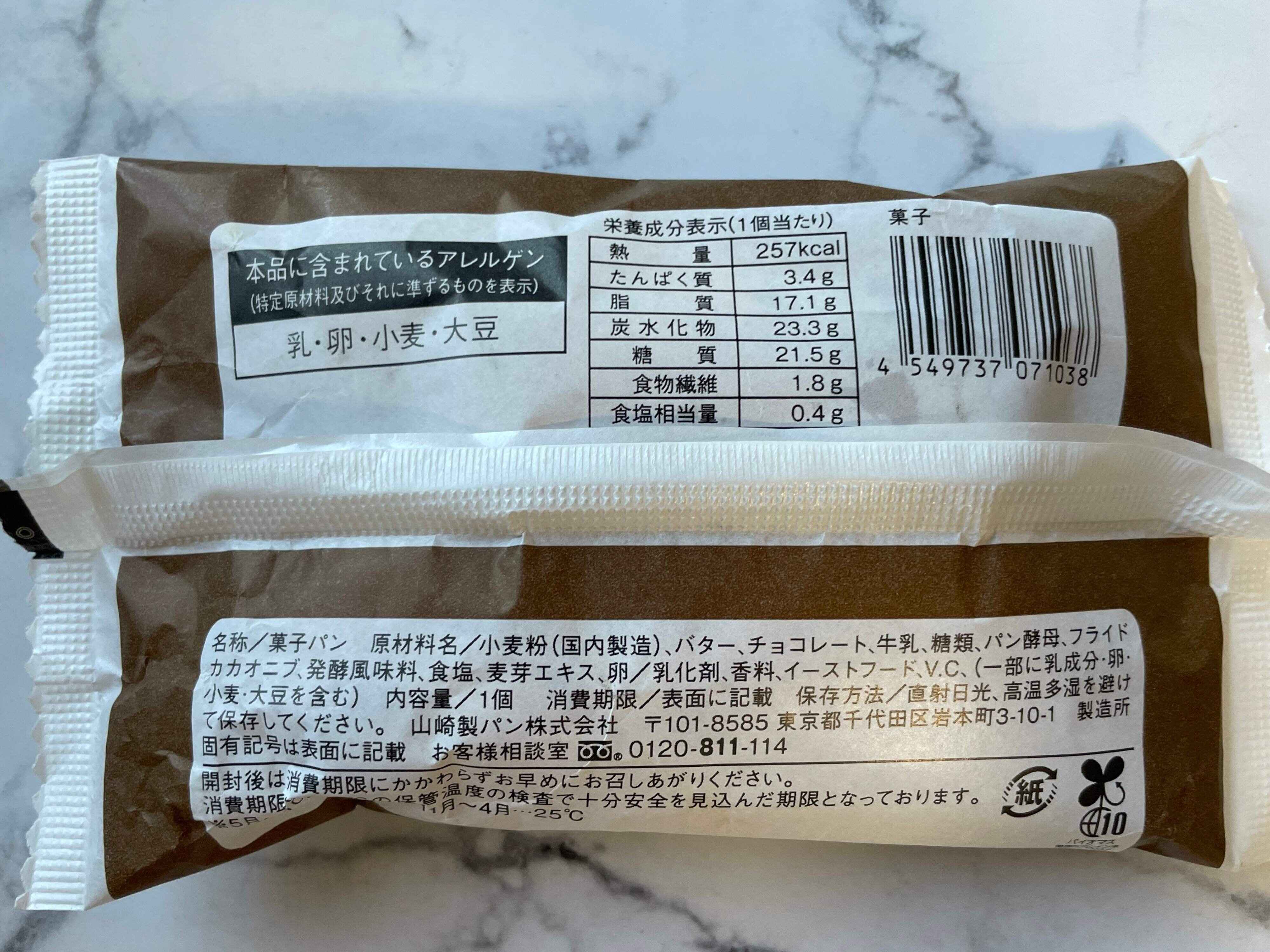 1個あたり257kcalです。バターにチョコの組み合わせなら300kcalを予想していたのですが、これは嬉しい!罪悪感なく食べられます。