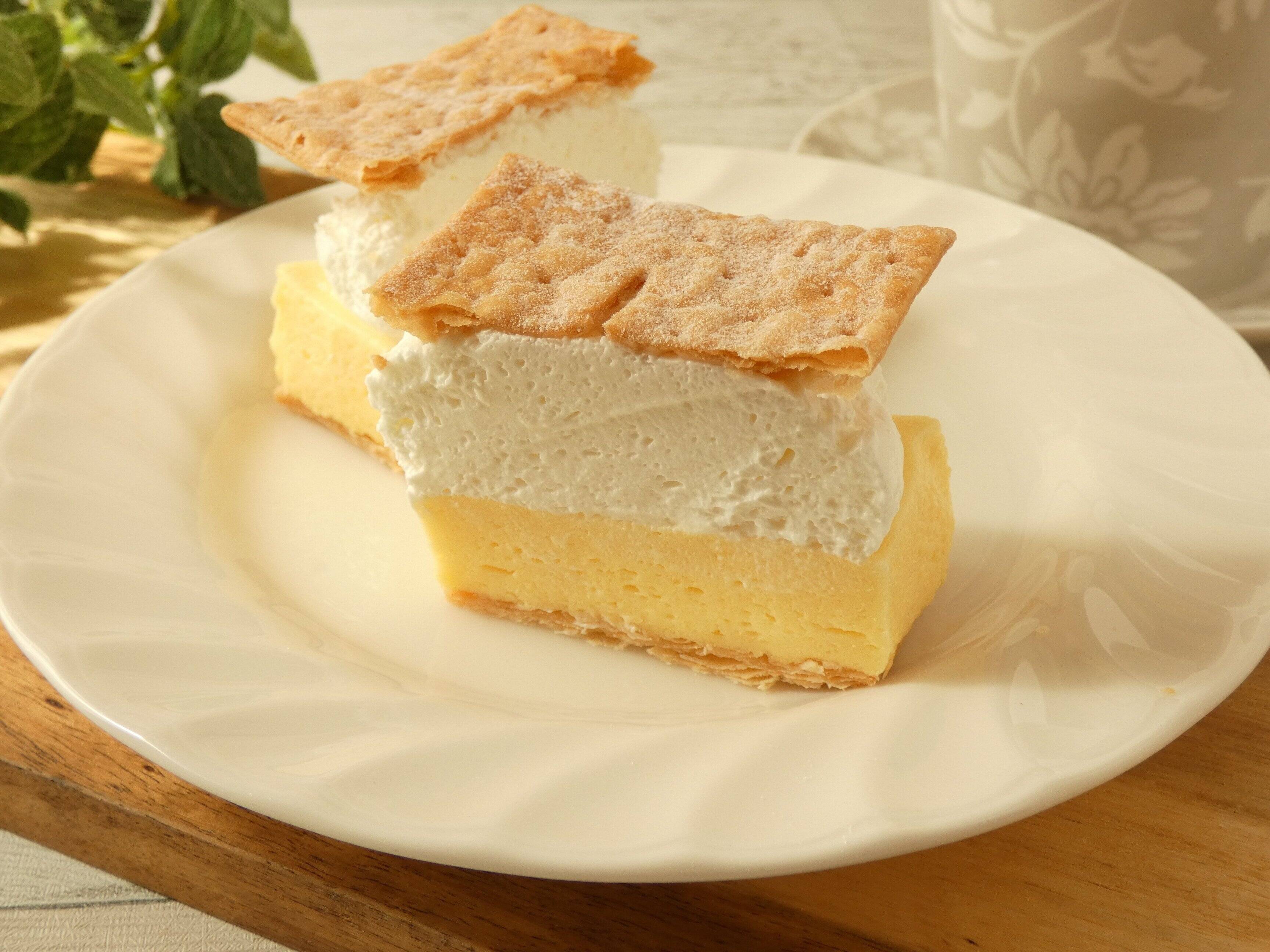 カットするとカスタードの厚さにビックリ。キレイな四角いカスタードなので、固めで弾力があると思いましたがふんわりとしています。カスタードの上には同じくらいの厚さのホイップが乗っていて、上下を薄いパリッとしたパイで挟んであります。