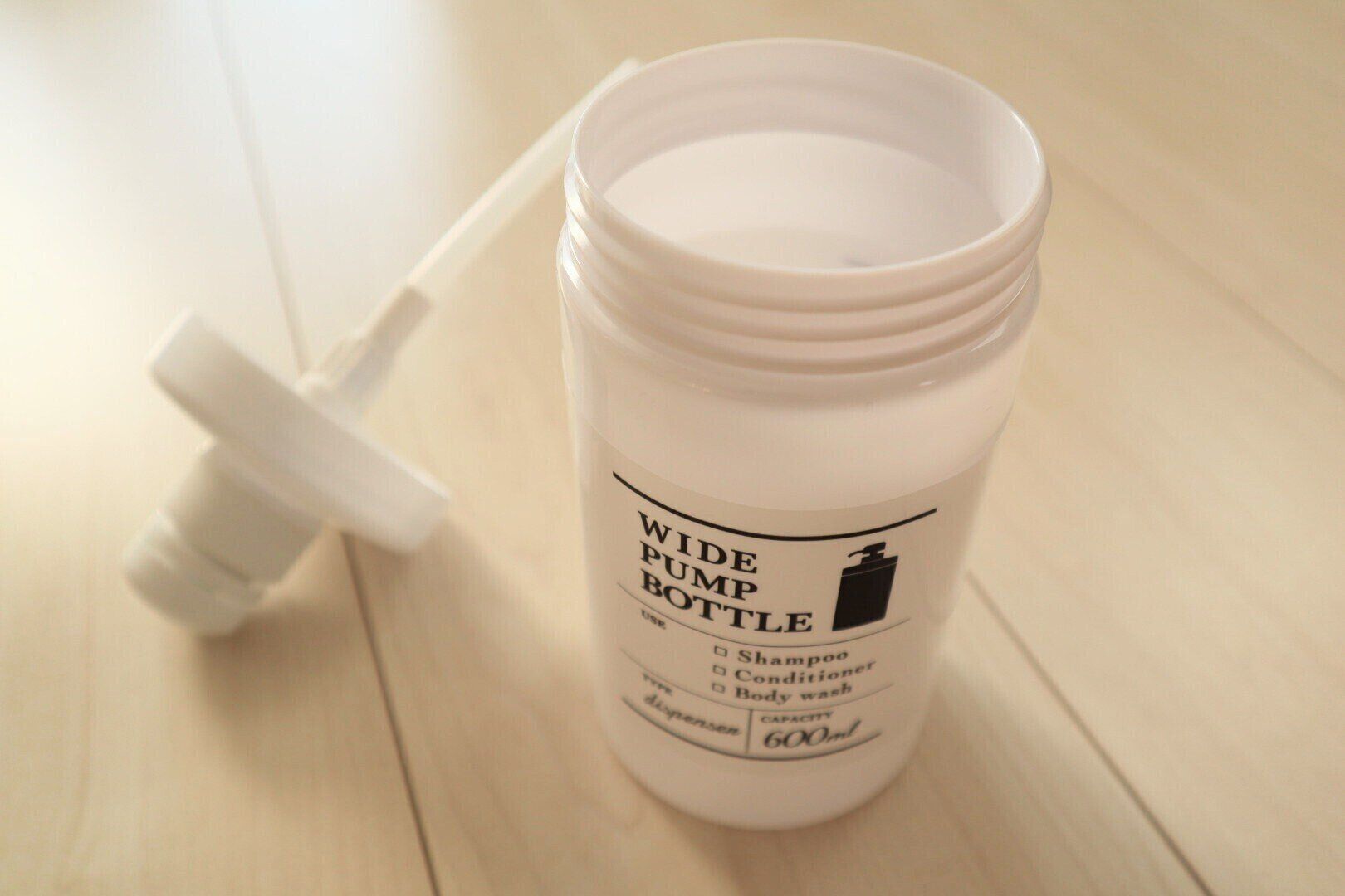 今回購入したセリアの『広口ポンプボトル』は蓋がパカッと外れるため、驚くほど詰め替えがラクになりました。大容量の詰め替えパウチを思い切り押してぐいぐい出すことができ、詰め替え作業が素早くラクに終わります。