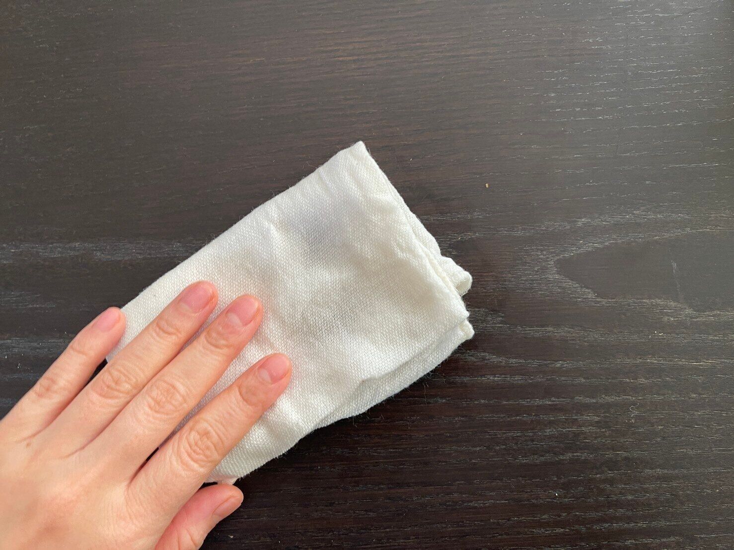一方、ダイニングテーブルを拭くときや、掃除の際は小さいサイズの「落ちワタ混ふきん」がおすすめです。
