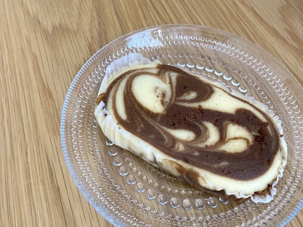 お皿に移そうと持ち上げただけで伝わるしっとり感。香りはチーズがほんのり香る程度で、この時点ではまだコーヒーの存在感はありません。マーブル状に混ざり合う生地がなんとも食欲をそそります。