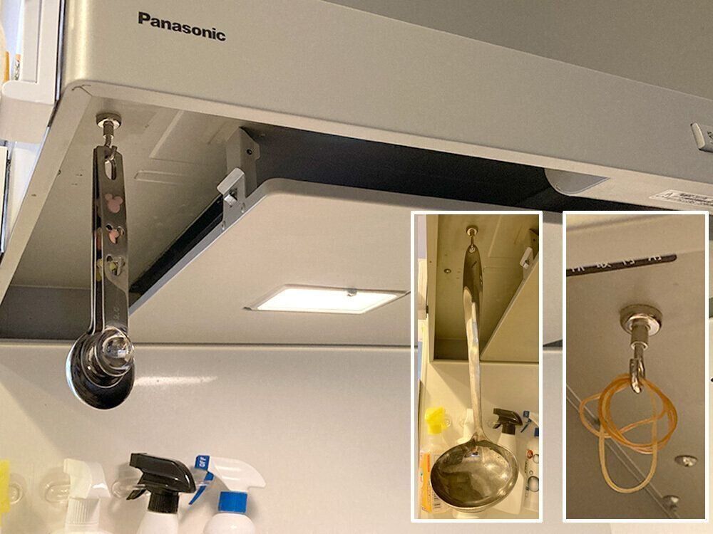 キッチンでは、コンロ上のレンジフードで磁石フックが便利に使えます。
