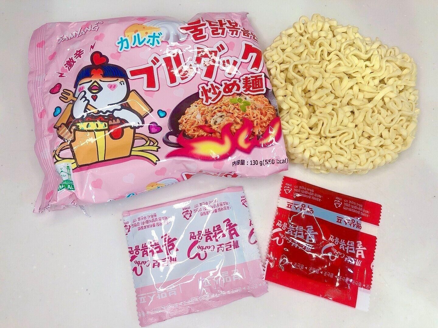 通常のノーマルなブルダックは私には辛すぎておいしく食べれませんがカルボ味は大好物です。韓国のインスタント汁なし麺は麺がもちもちなところがうれしい!