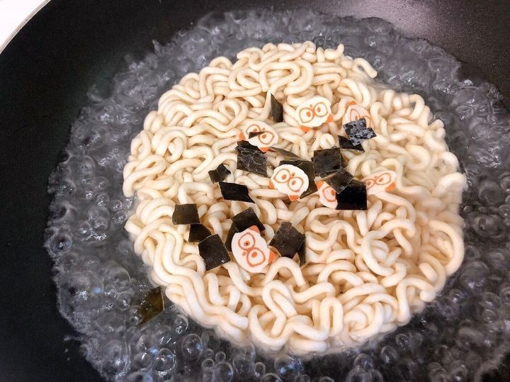 フライパンや鍋に350mlの水を入れて、沸騰したら麺とかやくを入れます。
