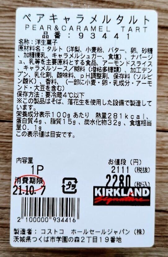 原材料名:タルト (洋梨、 小麦粉、バター、卵、砂糖 加糖練乳、キャラメルシュガー、食塩)、ナパージュ、乳等を主要原料とする食品、アーモンドスライス キャラメルソース/糊料(増粘多糖類)、 加工デン プン、乳化剤、酸味料、pH調整剤、保存料(ソルビ ン酸K)、香料、(一部に小麦・卵・乳成分・アーモ ンド・大豆を含む)