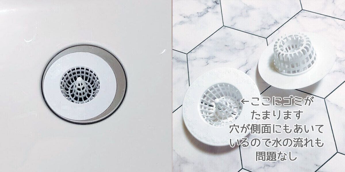 洗面台の排水口もゴミがたまりがち。小さい分、ちょっとたまるだけでも流れが悪くなるし、元々ついていたゴミ受けはとっても洗いにくくてイライラ。