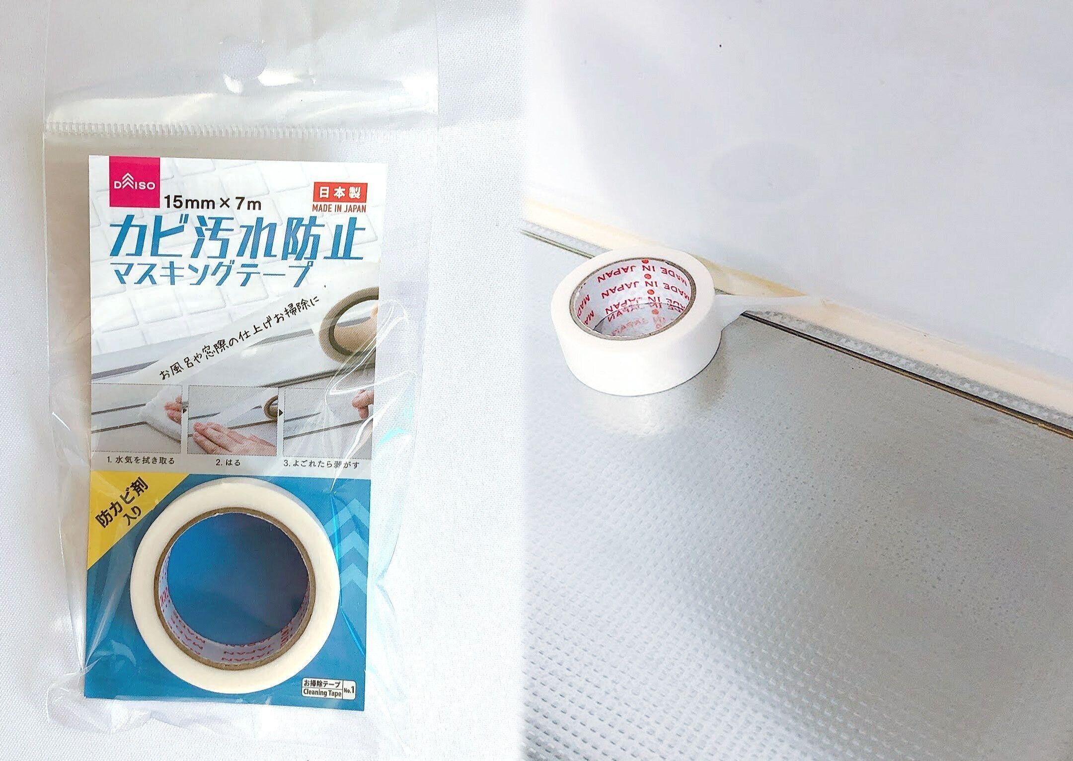 防カビ剤入りで、そもそものカビの発生を防いでくれる効果も期待できますが、テープの上にカビが……というときも、カビ以外の汚れがついたときも、マスキングテープを貼り換えるだけ!お風呂やキッチンで使っています。