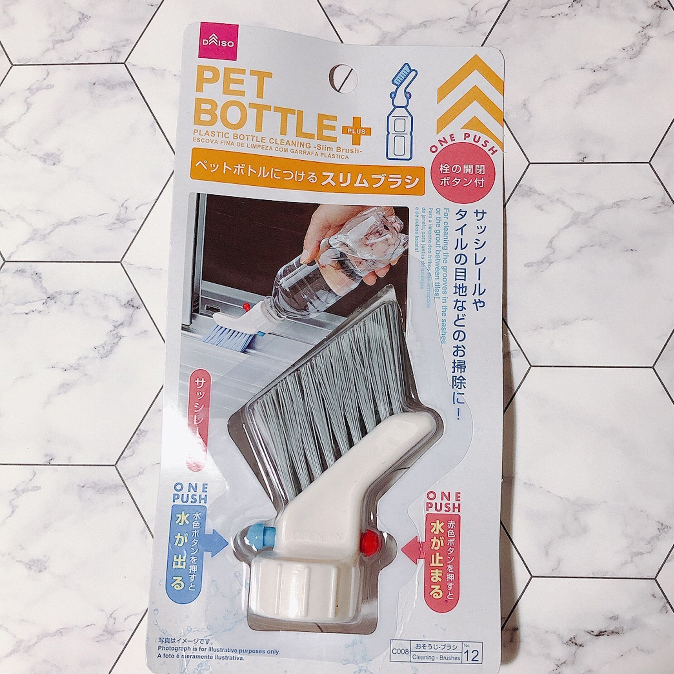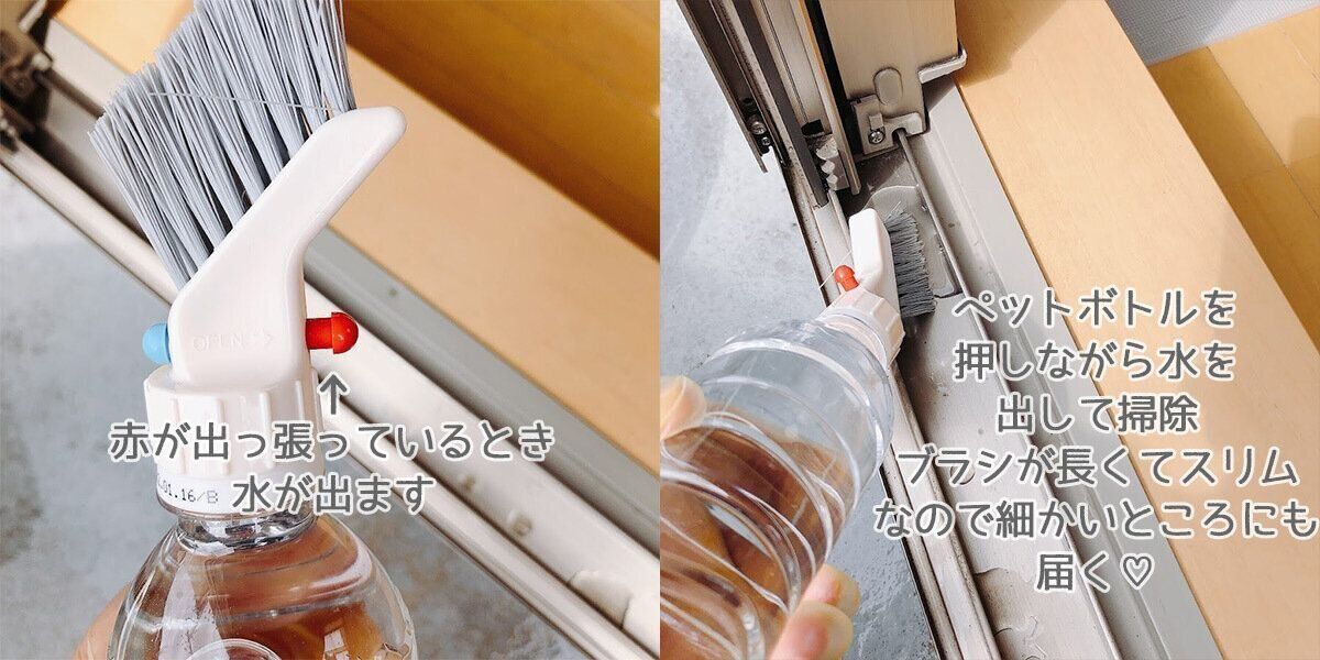 水を入れたペットボトルに取りつけるブラシ。水を流しながら洗って、最後に水を拭きとるだけで窓サッシ掃除は終了!