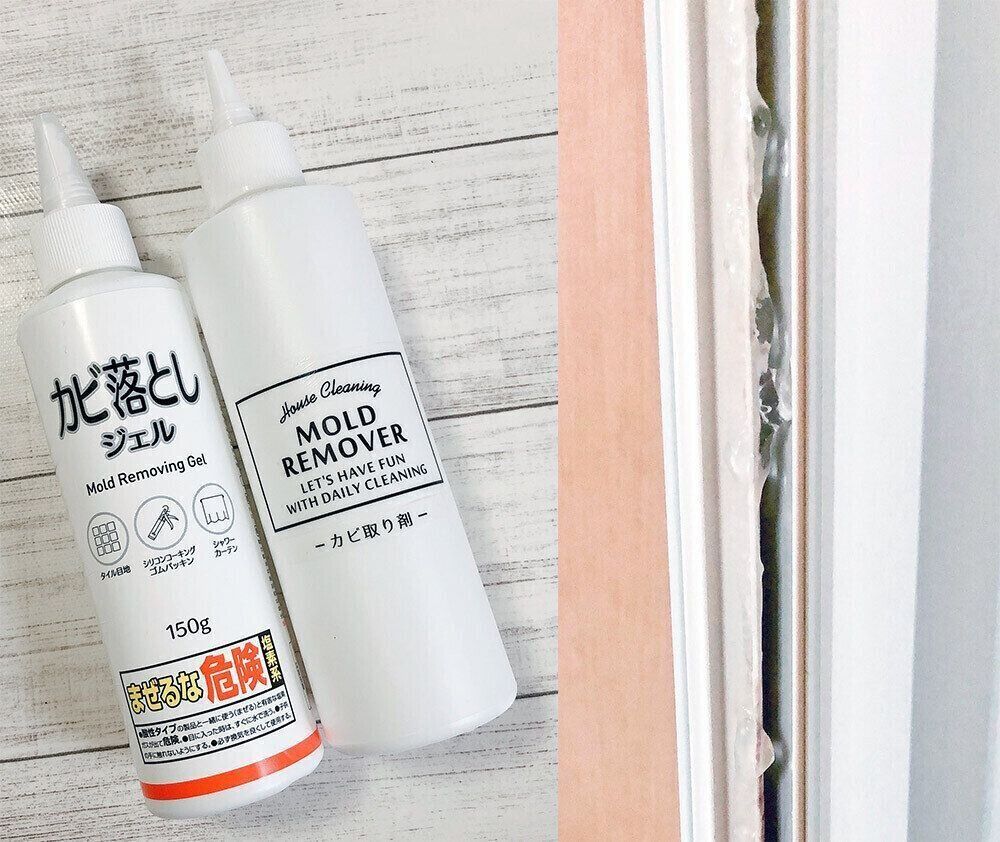 スプレータイプのカビ取り剤、もちろん落ちます。でも、かけて時間を置いている間に垂れてしまう。それを解消してくれたのがカビ取りジェル。流れてしまうことがないので安心です。