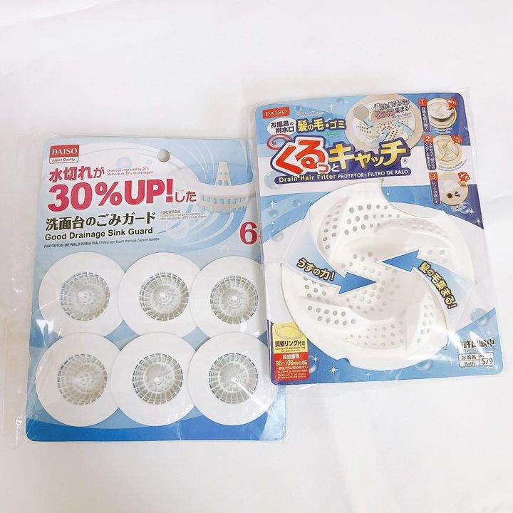 その後いろんなタイプを試してみましたが、今はダイソーの「水切れが30%UPした!洗面台のごみガード」に落ち着きました。