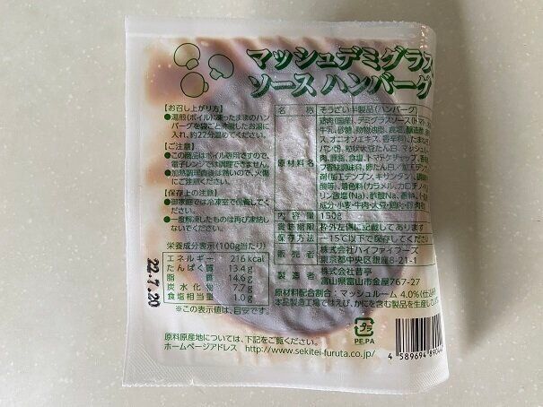 こちらも同じく1個売りの冷凍ハンバーグ。「マッシュデミグラスソースハンバーグ」(購入時:95円)も同じ会社で製造されているハンバーグです。