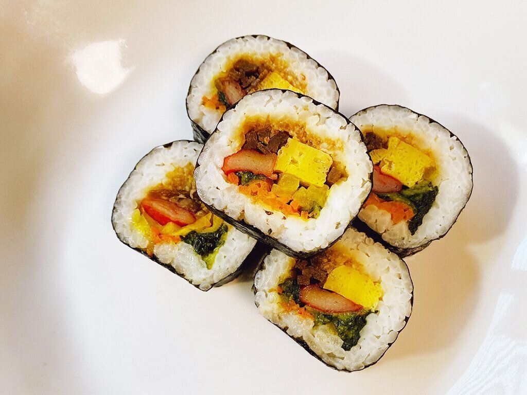 たくあんのポリポリとした食感や、濃い味の牛肉、甘い卵、カニカマなど、子供も喜びそうな中身でした。そしてかなりボリュームがあります。
