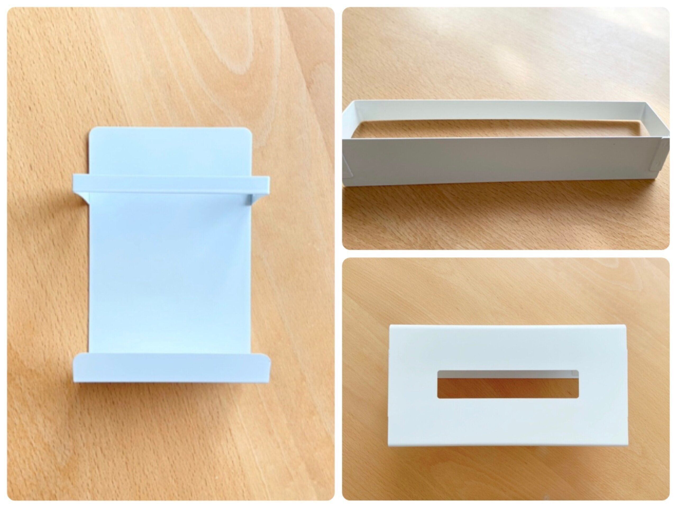 ホワイトとブラックの2色展開でとってもシンプルな見た目も素敵。ラップホルダー、マルチ収納棚、冷蔵庫小物収納、タオル収納フック、スパイス収納棚、四連フック、フック(2個)、二連フック(2個)、レンジフードフックなど種類もとても豊富です。