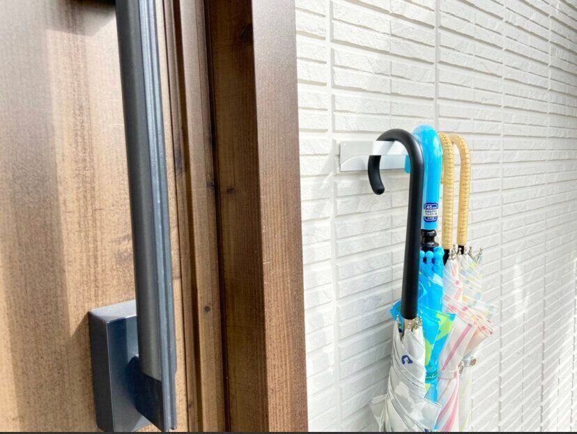 我が家では付属のマグネットではなく、魔法のテープを活用して、玄関の扉横に雨に濡れた傘を収納する一時置きのホルダーとして活用しています。