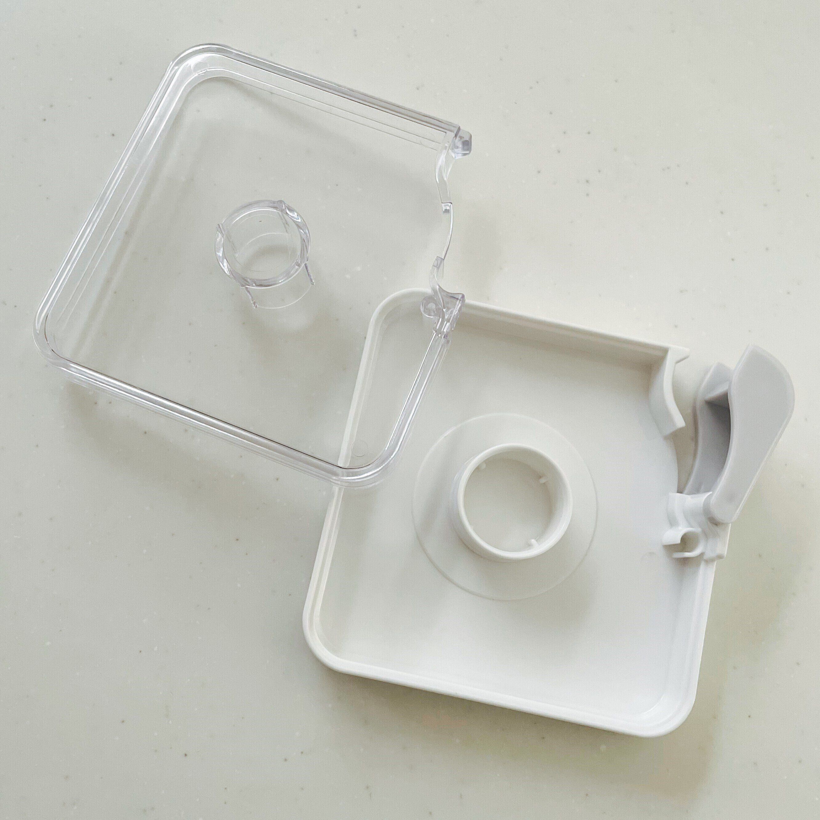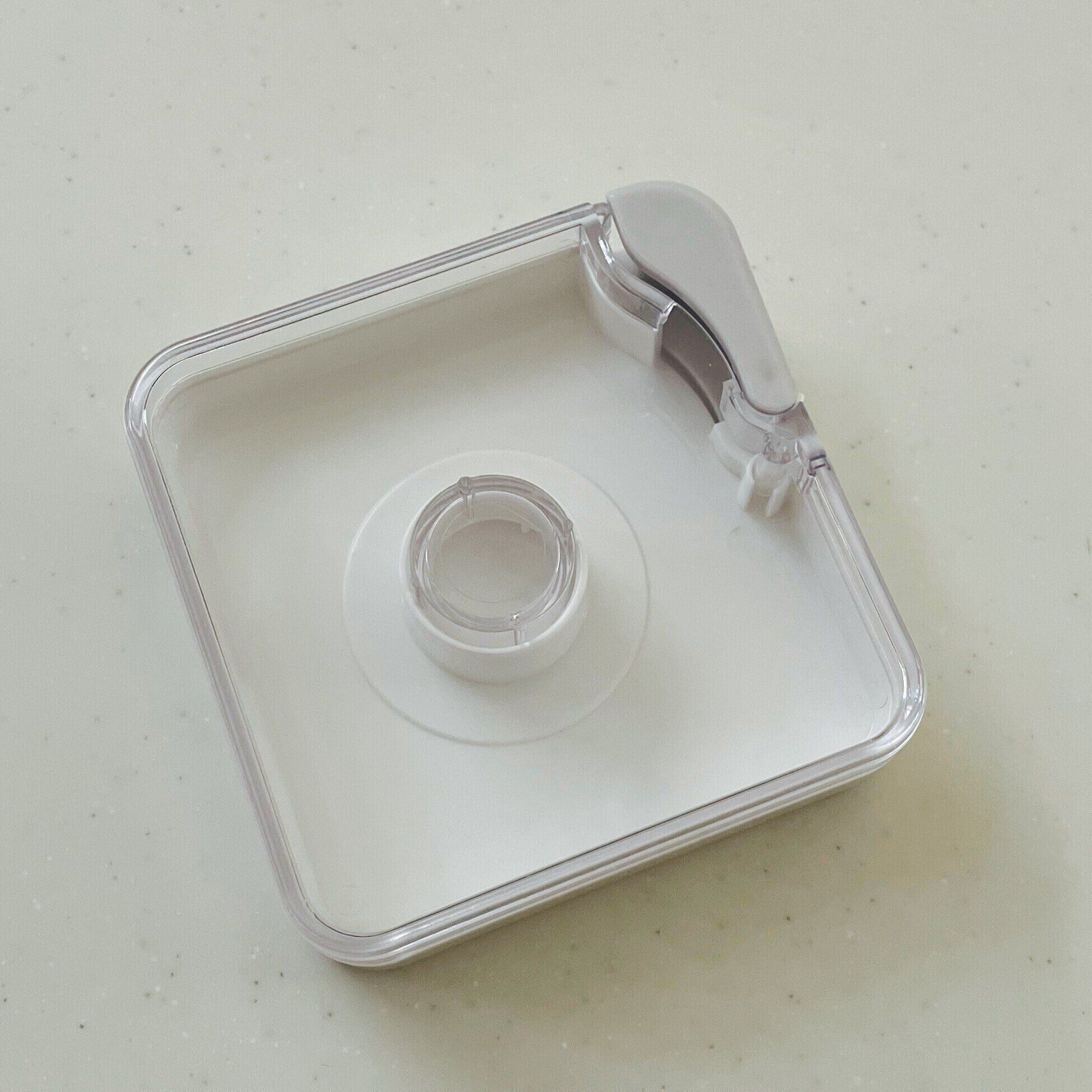絆創膏や包帯などの棚で見つけました。縦・横7.8cmのスクエアケース。テープを中に入れてホコリやゴミから守ってくれる商品です。